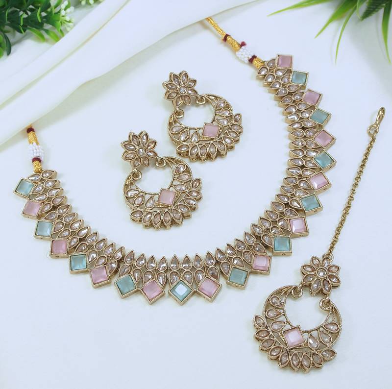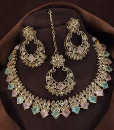 | Product Name | Beautiful Multicolor Antique Gold Plated Ad/Zircon Work Polki Necklace Jewelry Set With Maangtika | |