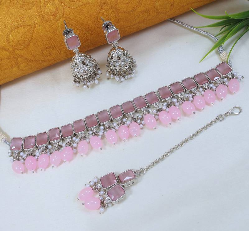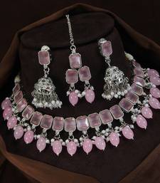 | Product Name | Beautiful Pink Rhodium Plated Ad/Zircon Work Polki Necklace Jewelry Set With Maangtika | |