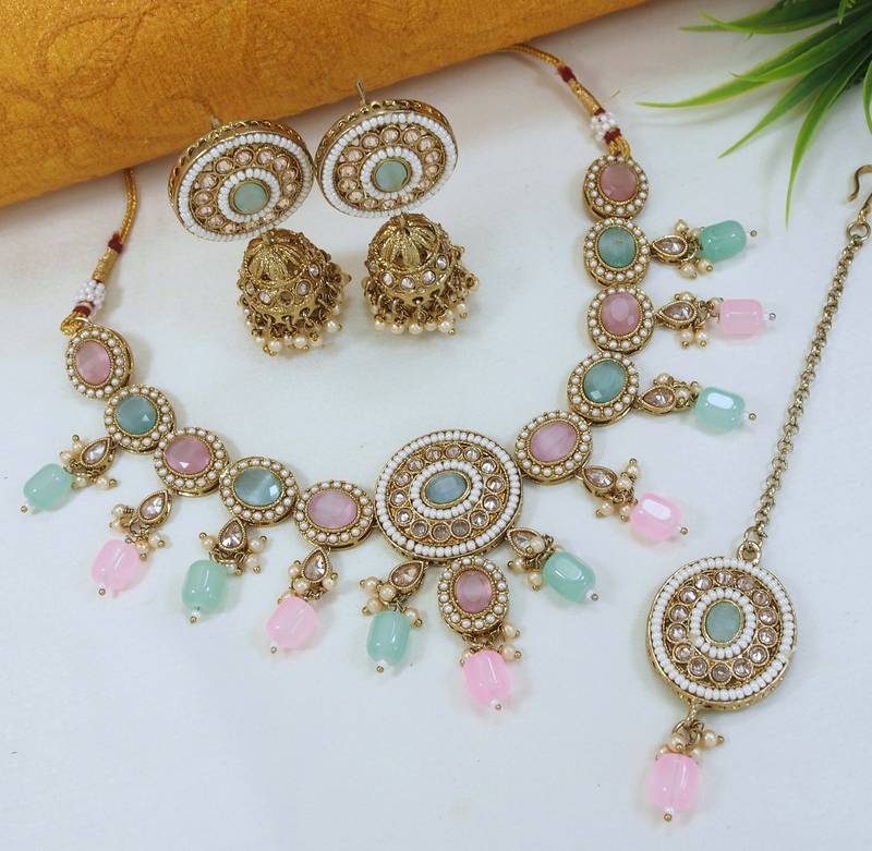 | Product Name | Designer Multicolor Mehendi Gold Plated Ad/Zircon Work Polki Necklace Jewelry Set With Maangtika | |