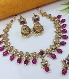 | Product Name | Marvelous Wine Color Mehendi Gold Plated Ad/Zircon Work Polki Necklace Jewelry Set With Maangtika | |