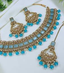 | Product Name | Stunning Firozi Mehendi Gold Plated Ad/Zircon Work Polki Necklace Jewelry Set With Maangtika | |