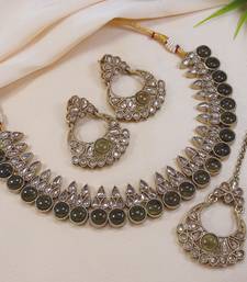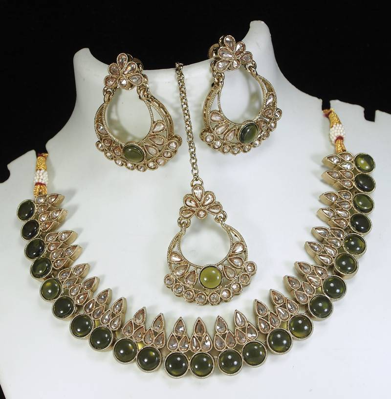 | Product Name | Stunning Green Antique Gold Plated Ad/Zircon Work Polki Necklace Jewelry Set With Maangtika | |