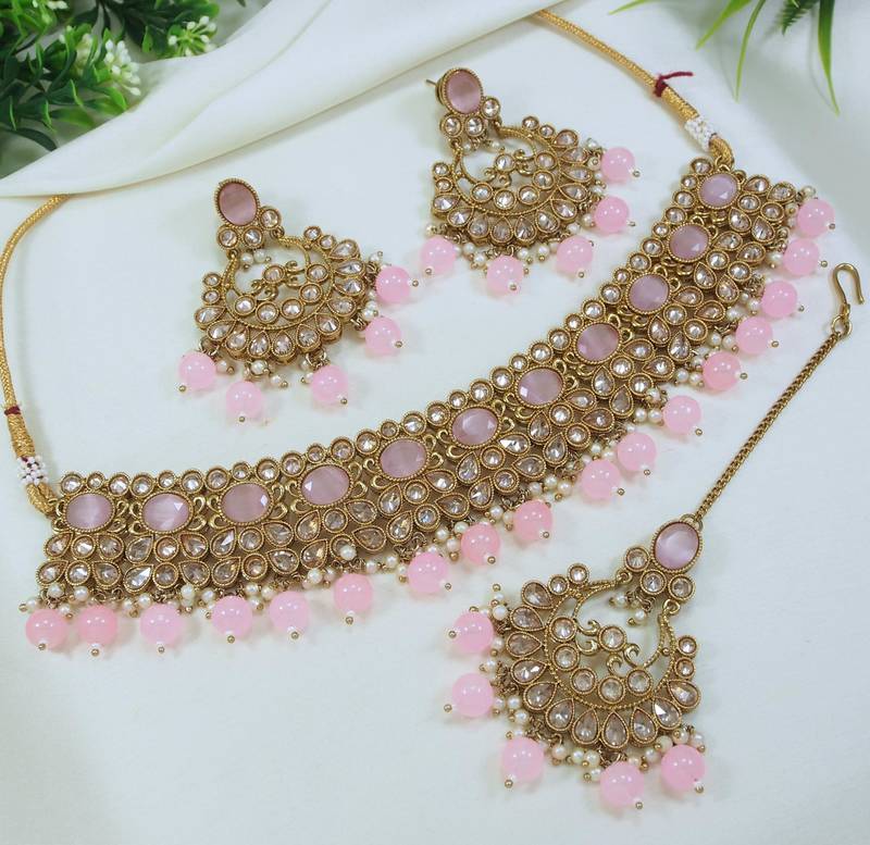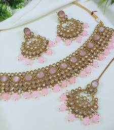 | Product Name | Stunning Pink Mehendi Gold Plated Ad/Zircon Work Polki Necklace Jewelry Set With Maangtika | |