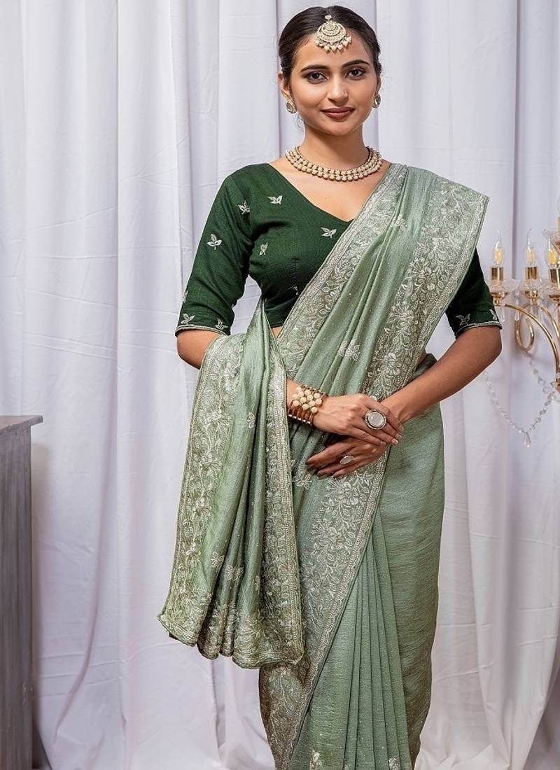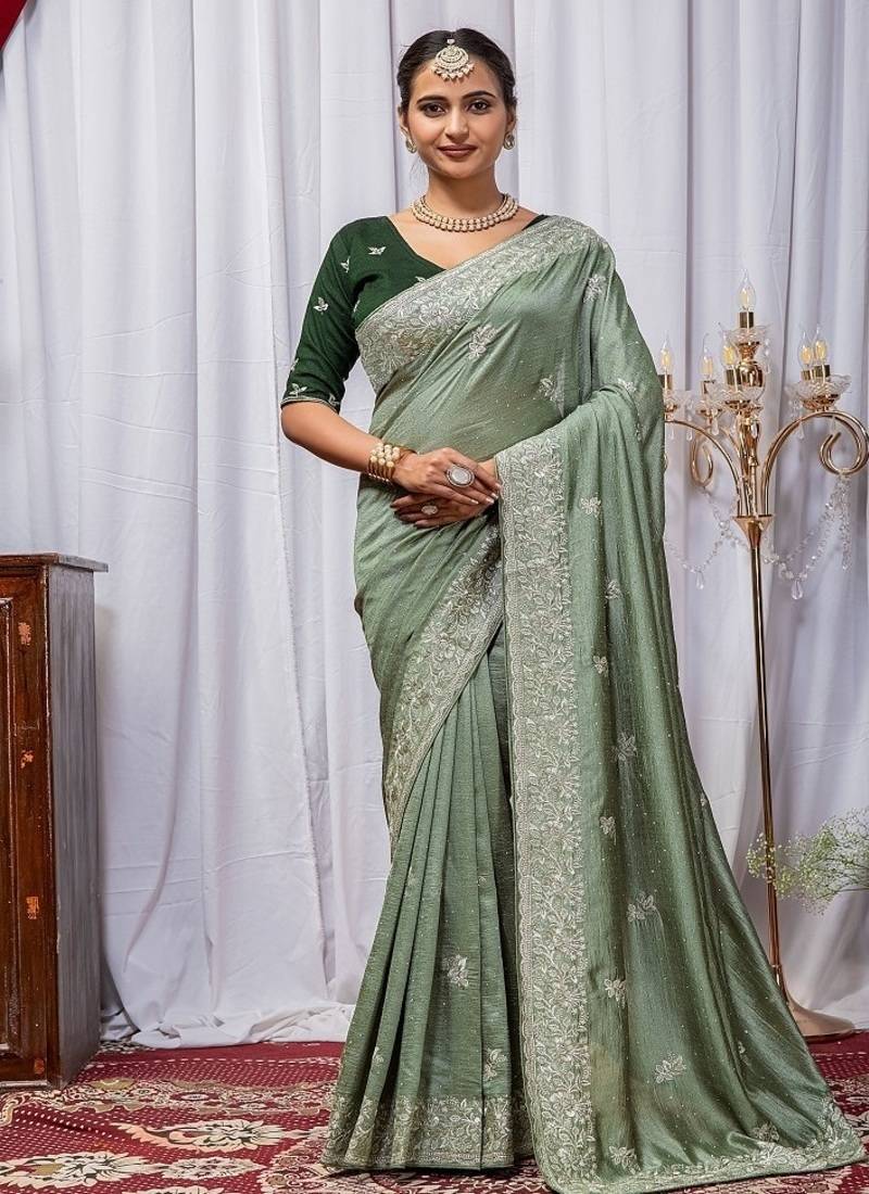 Light green color zari embroidery hotflix diamond work vichitra silk saree