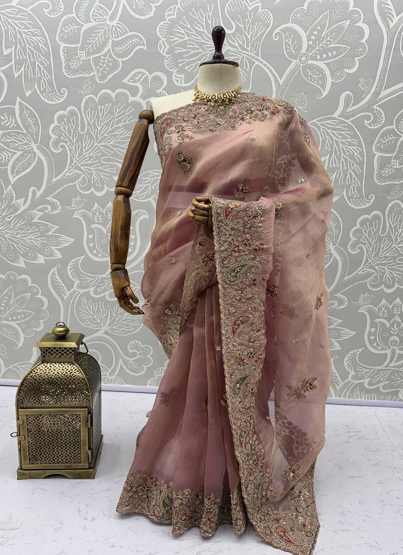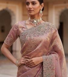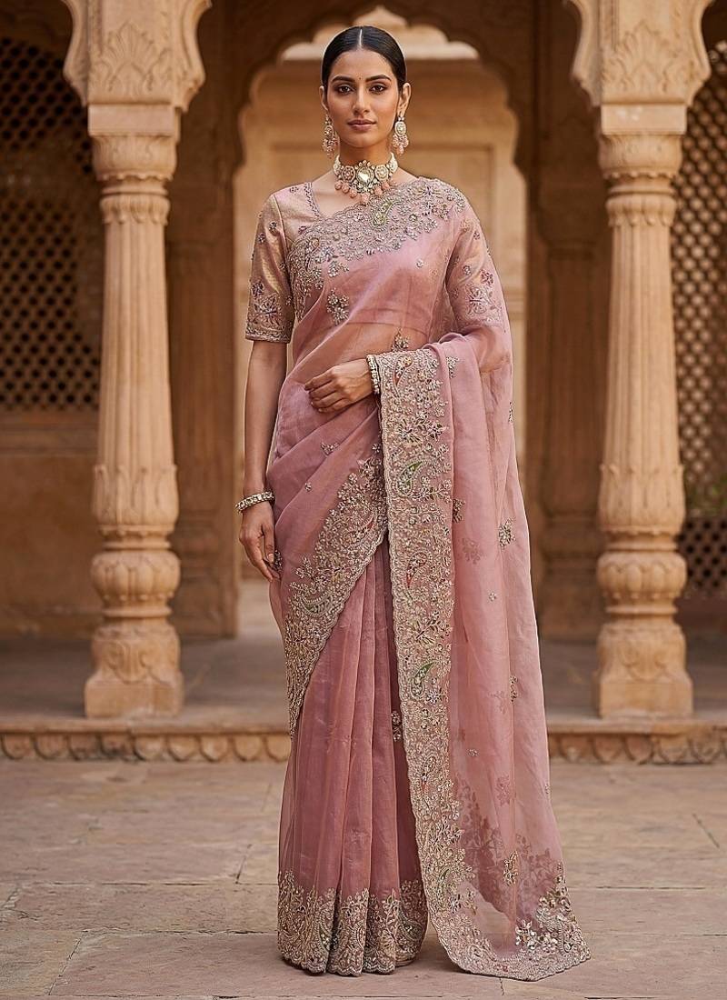 Onion pink color patch embroidered,dori,multi thread and zari with sequins and zircon diamond work silk saree