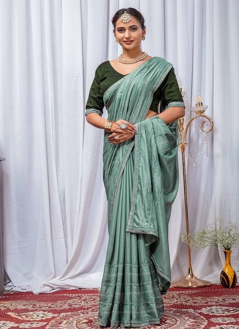 Sea green color zari embroidery hotflix diamond work vichitra silk saree