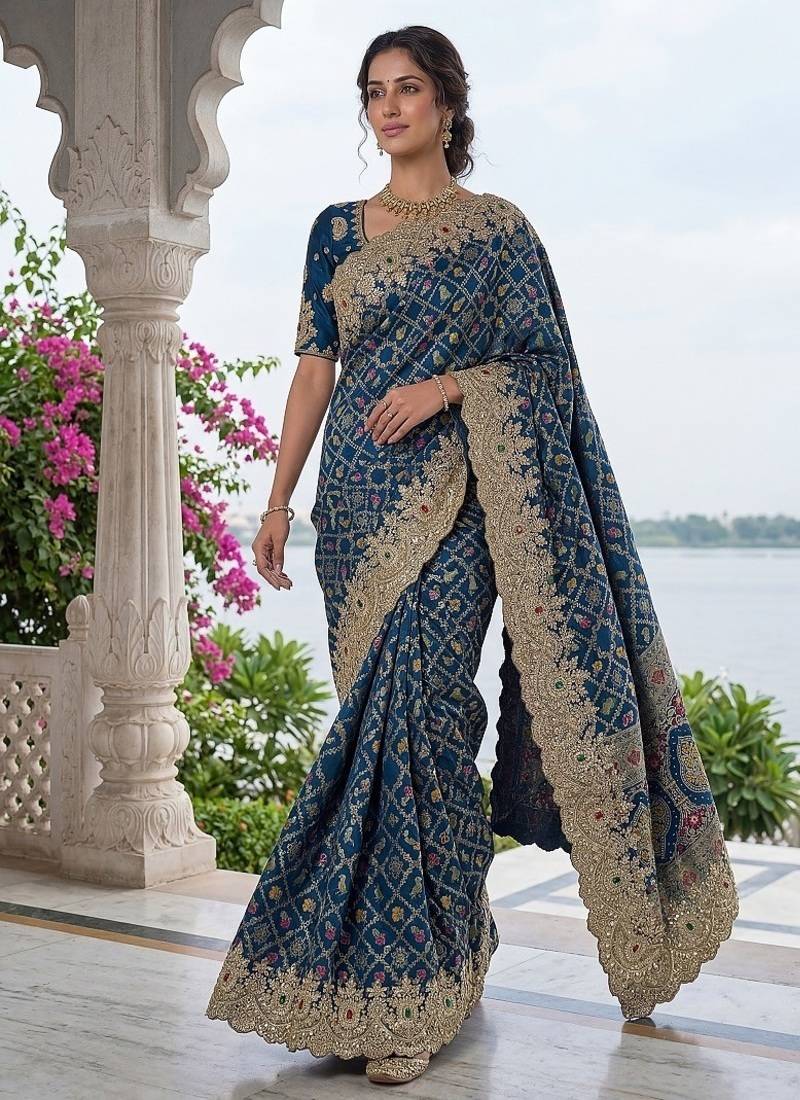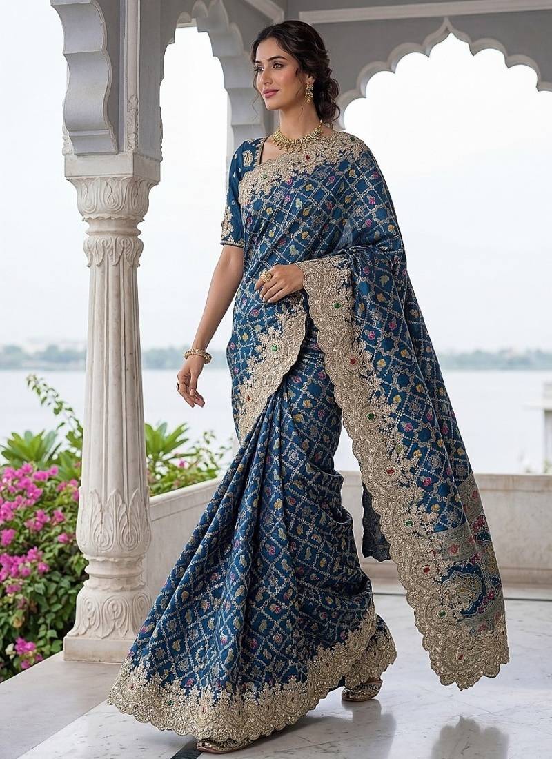 | Product Name | Teal Color Embroidered Lace,Dori,Multi Thread And Zari With Sequins And Zircon Diamond Work Banarasi Silk Saree | |