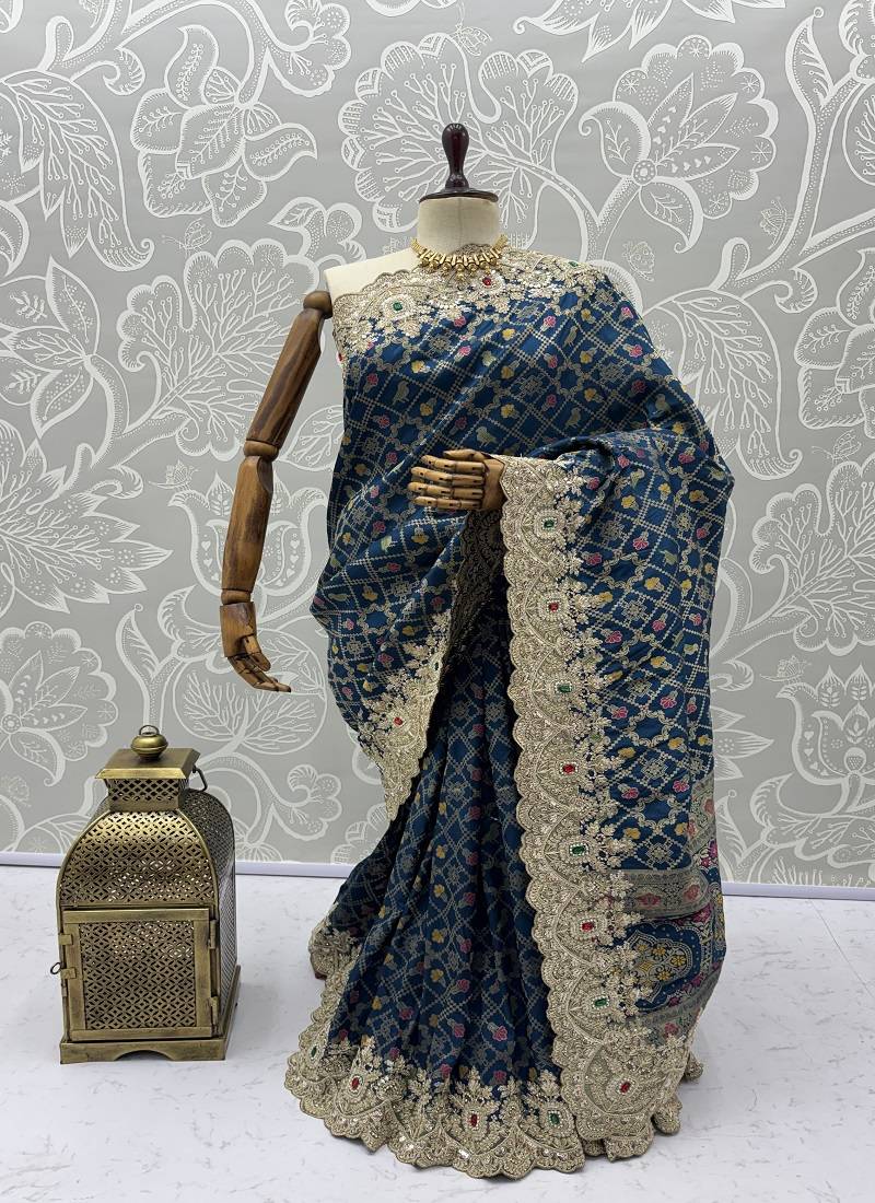 Teal color embroidered lace,dori,multi thread and zari with sequins and zircon diamond work banarasi silk saree