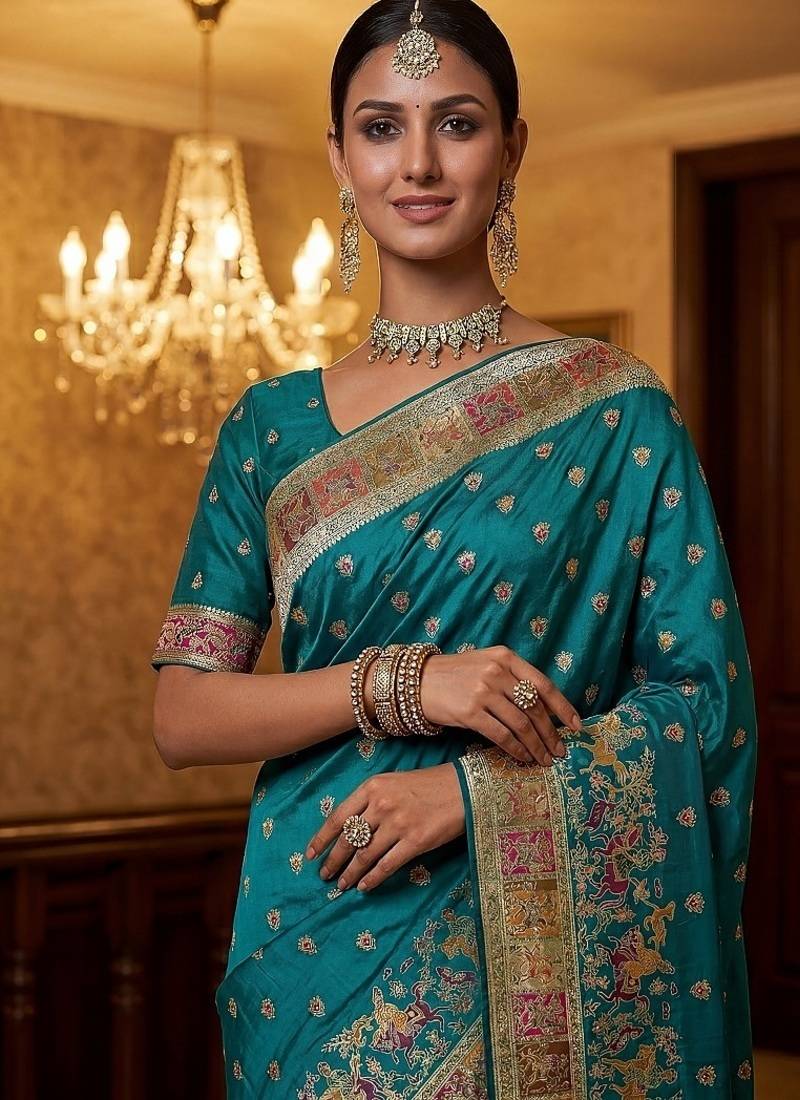 | Product Name | Turquoise Color Foliate Pattern,Zari And Shikaragh Zal Work Pashmina Silk Saree | |