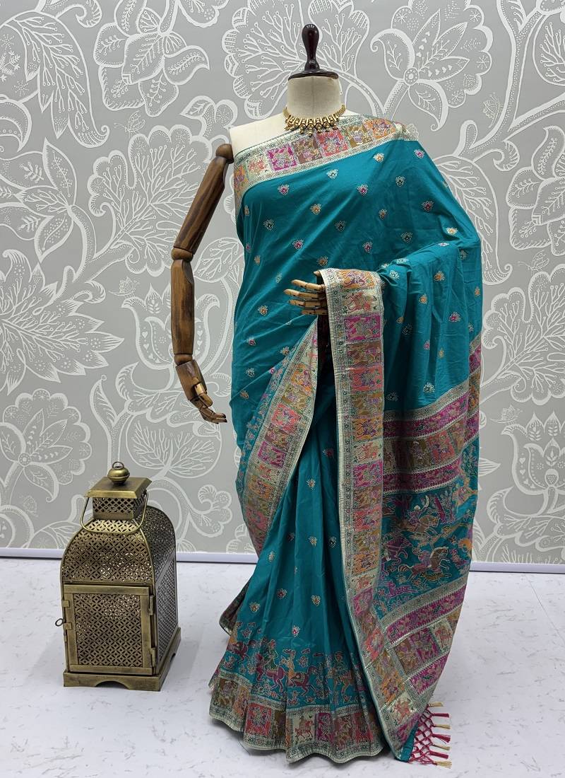 Turquoise color foliate pattern,zari and shikaragh zal work pashmina silk saree