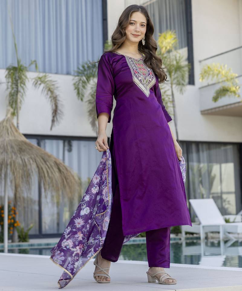 Purple chanderi silk embroidered round neck kurta pant set with jacquard organza dupatta