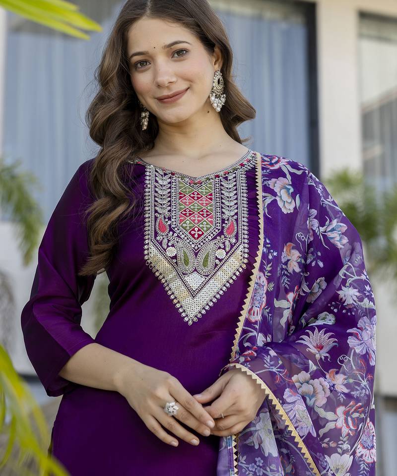 | Product Name | Purple Chanderi Silk Embroidered Round Neck Kurta Pant Set With Jacquard Organza Dupatta | |
