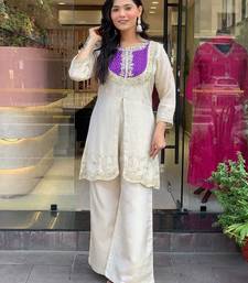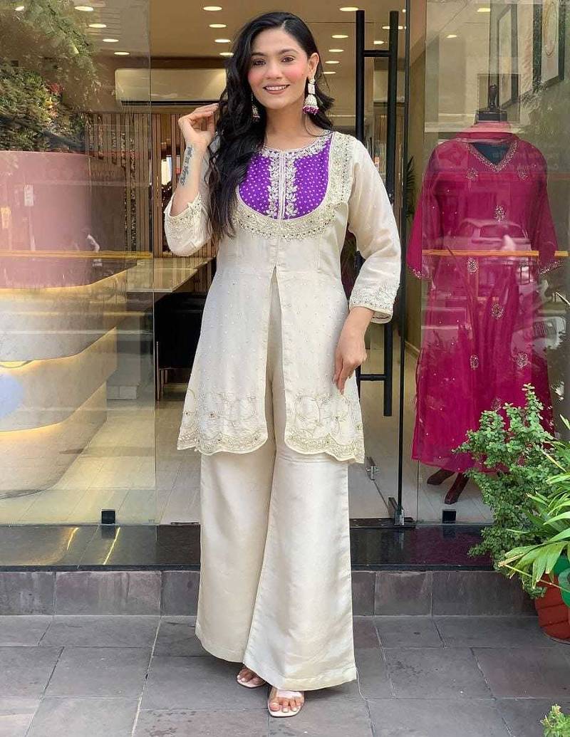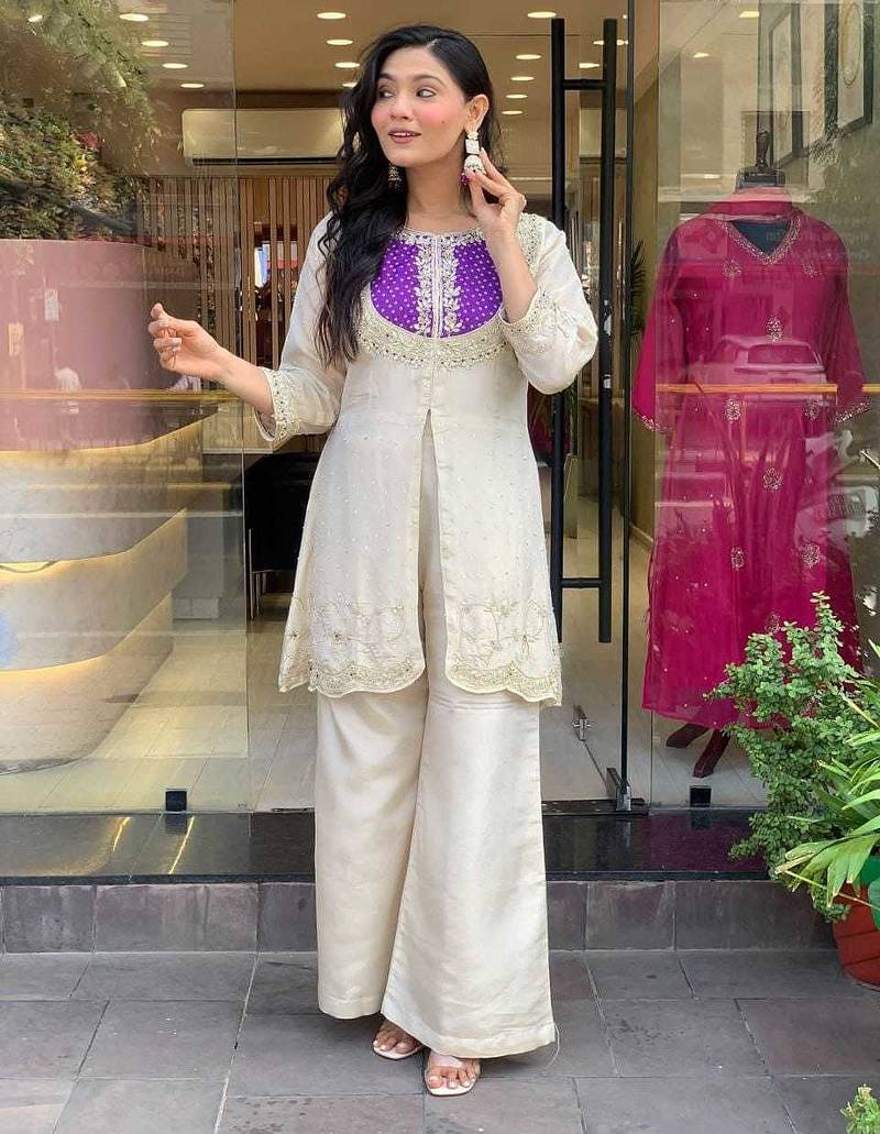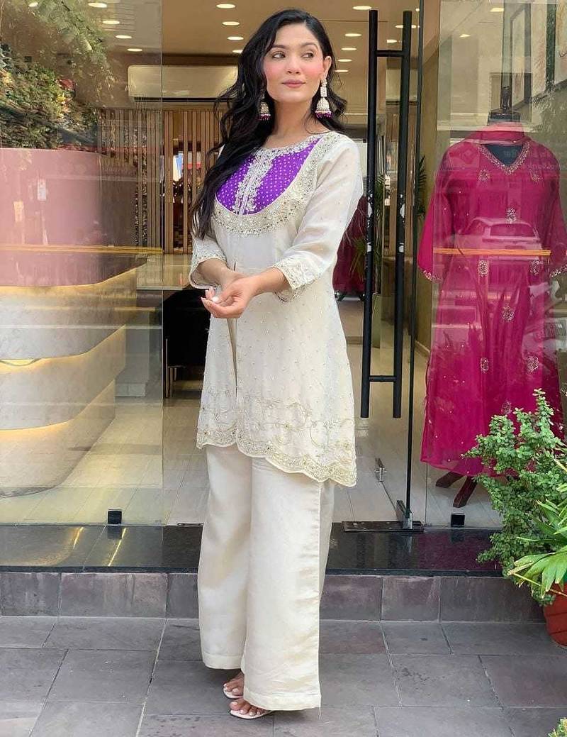 | Product Name | Elegant Off White Embroidered Kurti Set With Purple Yoke Design | |