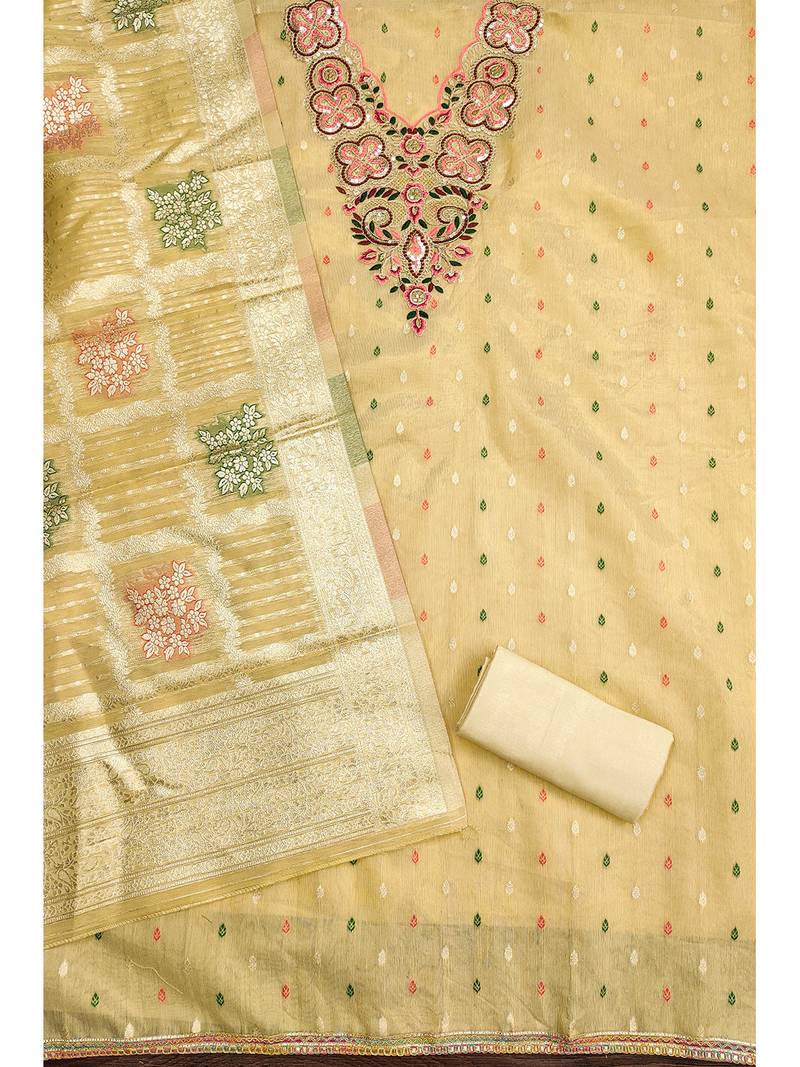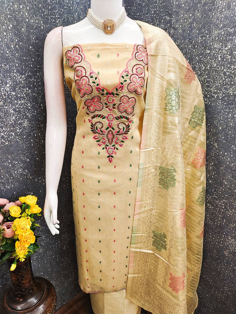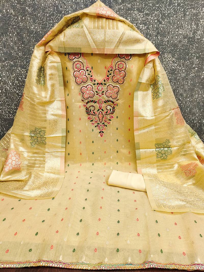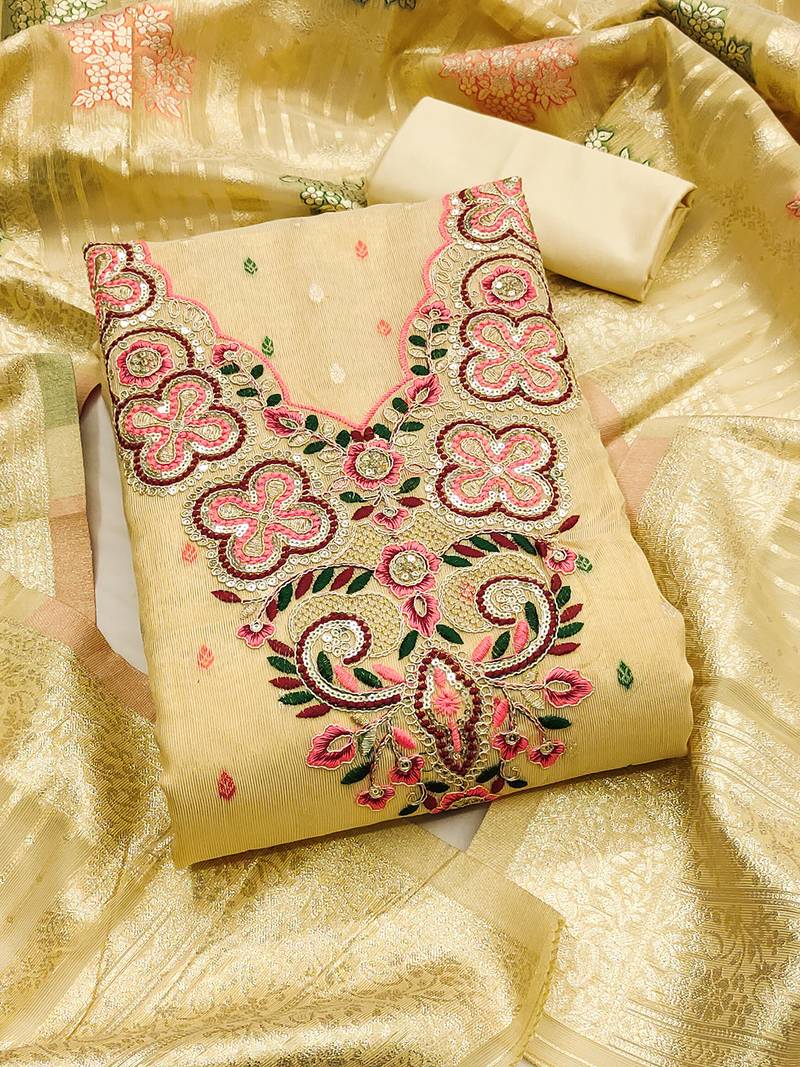 Elegant simmer butti embroidered dress material with jacquard dupatta & santoon bottom unstitched