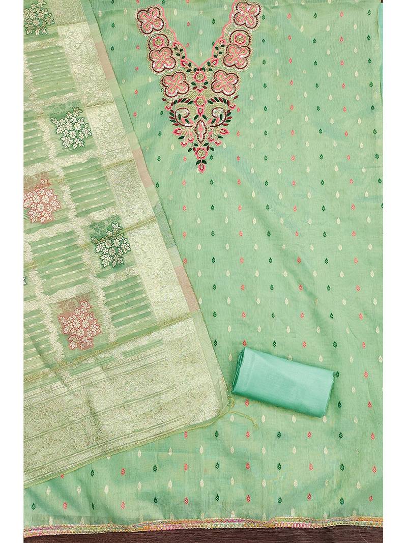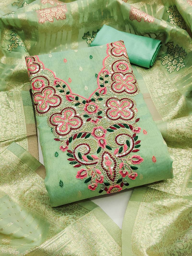 Elegant simmer butti embroidered dress material with jacquard dupatta & santoon bottom unstitched
