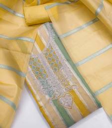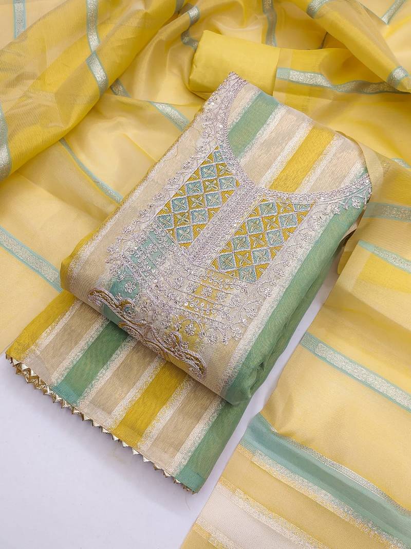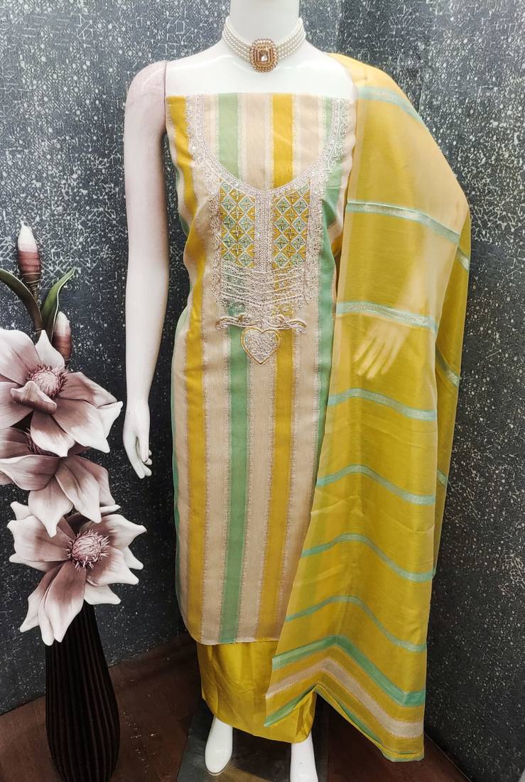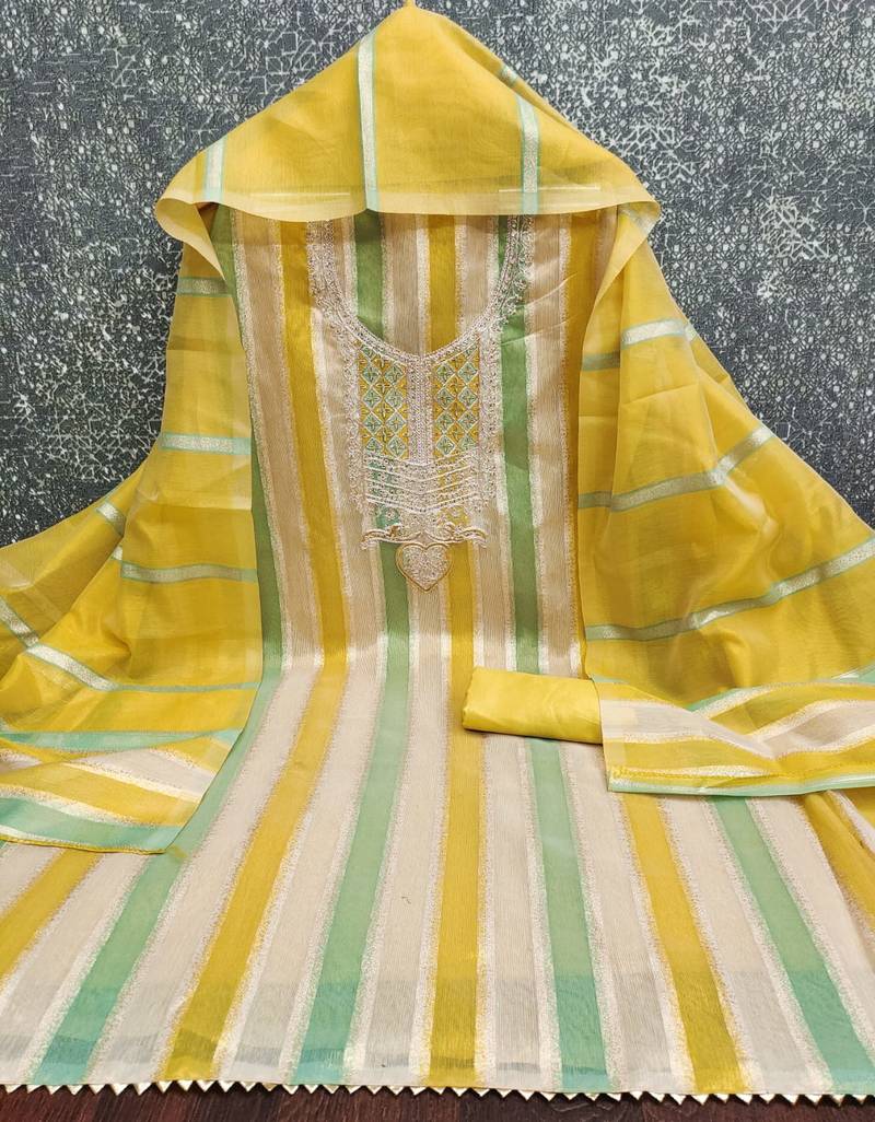 Elegant yellow striped embroidered kurta set with dupatta for women unstitched