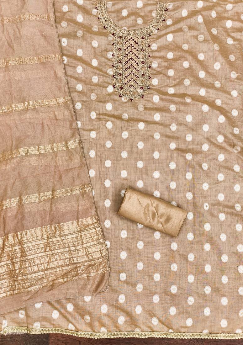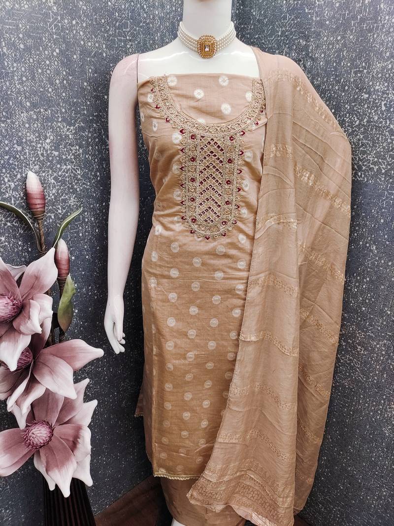 | Product Description | Elevate Your Ethnic Style With This Graceful Unstitched Salwar Suit Featuring Intricate Embroidery On The Neckline And Subtle Butti Prints. Paired With A Matching Bottom And A Beautifully Woven Dupatta, This Outfit Offers A Perfect Blend Of Elegance And Comfort, Ideal For Festive Occasions And Casual Gatherings. |