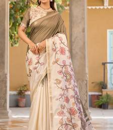Brown & cream pure tussar silk printed saree with blouse