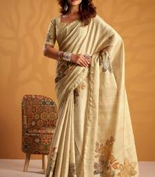Cream pure tussar silk printed with kasheeda work saree with blouse