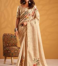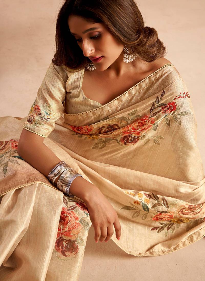 Cream pure tussar silk printed with kasheeda work saree with blouse