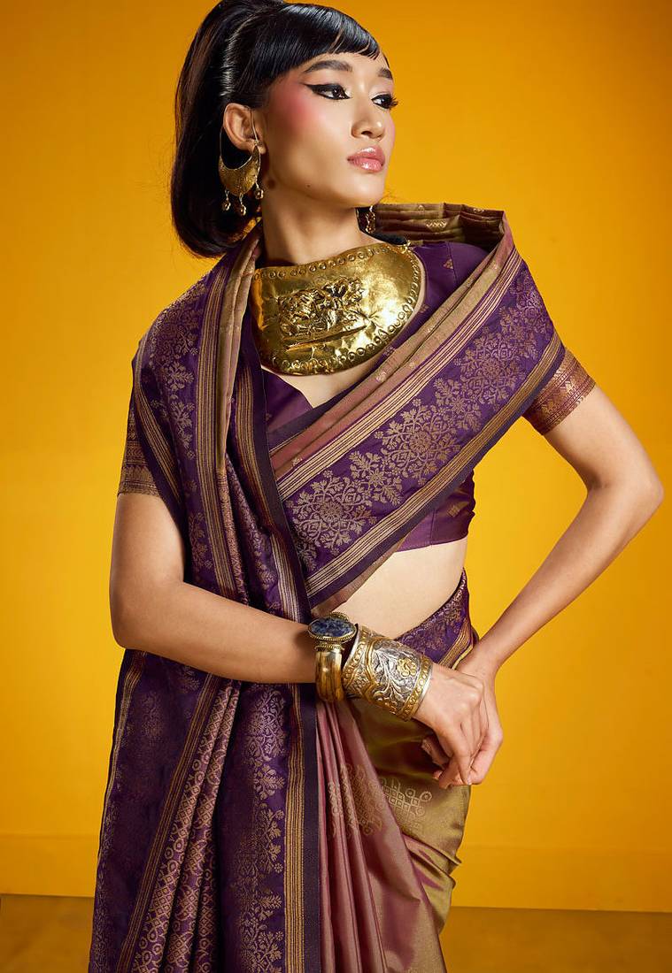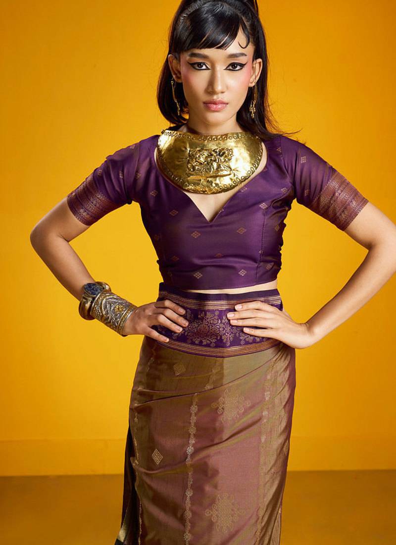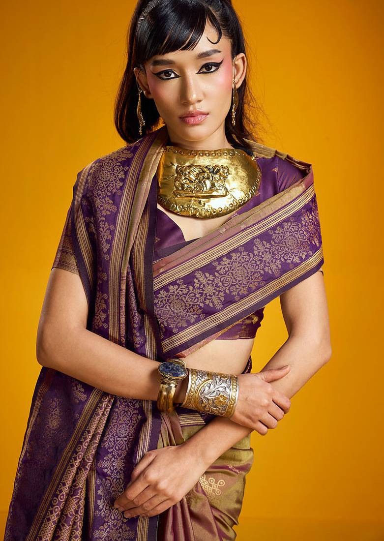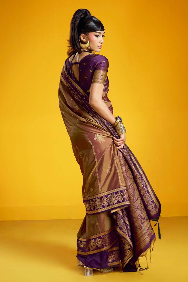 | Product Description | Saree Fabric: Pure Silk, Saree Color: Golden, Blouse Fabric: Pure Silk, Blouse Color: Purple, Work: Handloom Zari Weaving, Remark: Saree With Blouse |