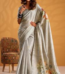Grey pure tussar silk printed with kasheeda work saree with blouse