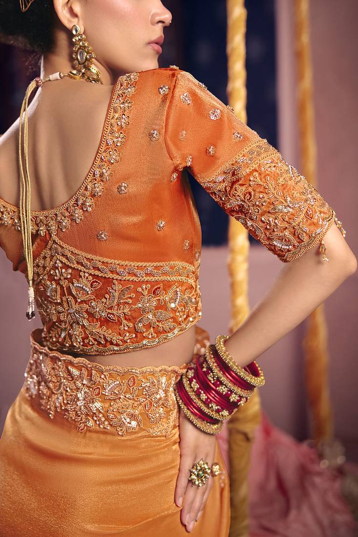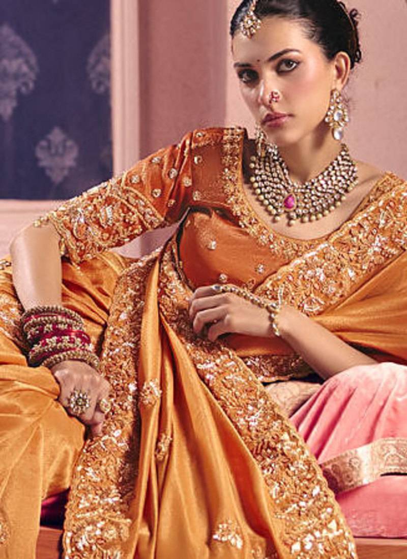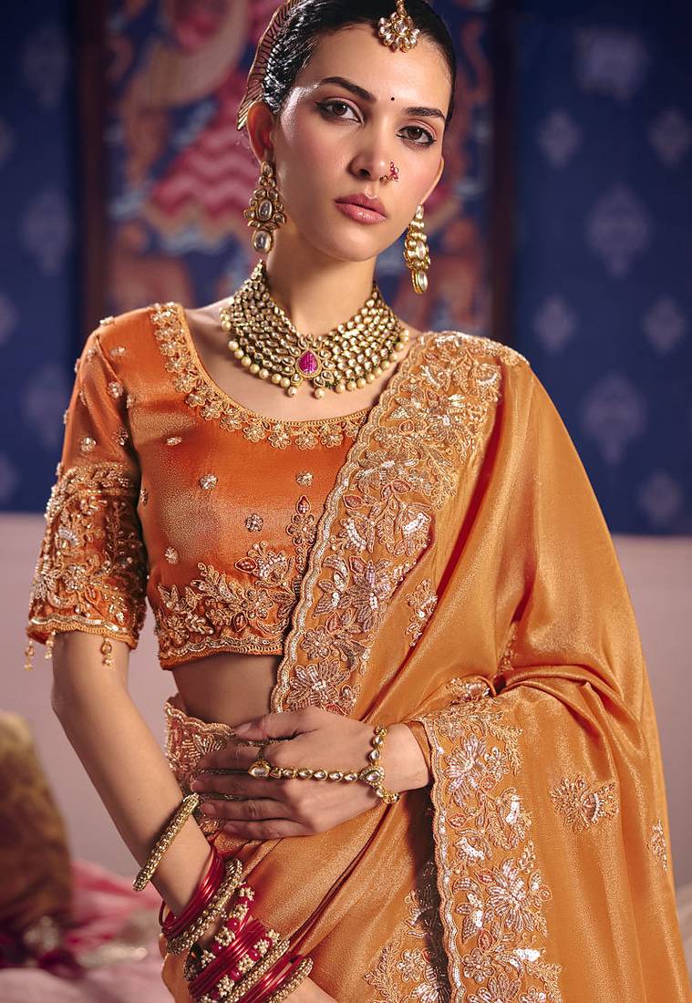 | Product Name | Orange Viscose Zari Tissue Silk Heavy Embroidery, Beads With Sequince Work Saree With Blouse | |