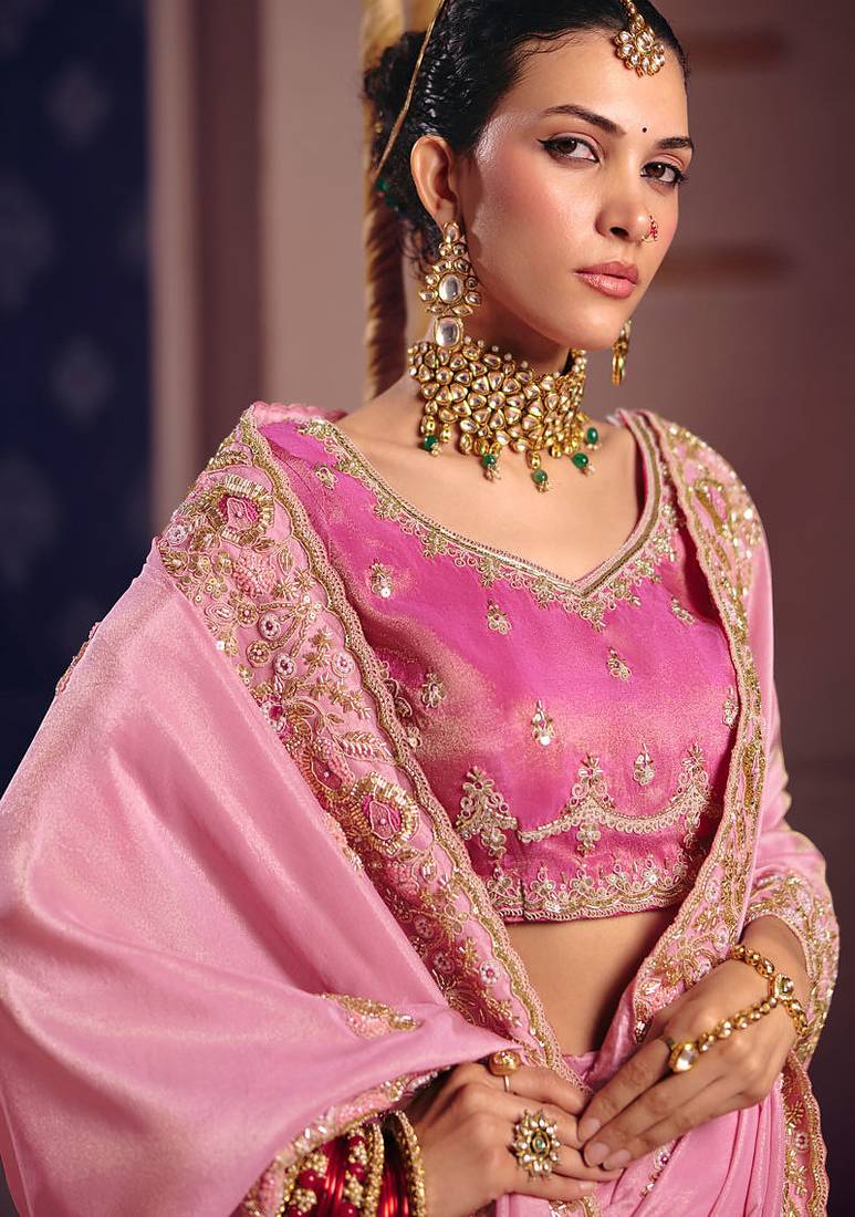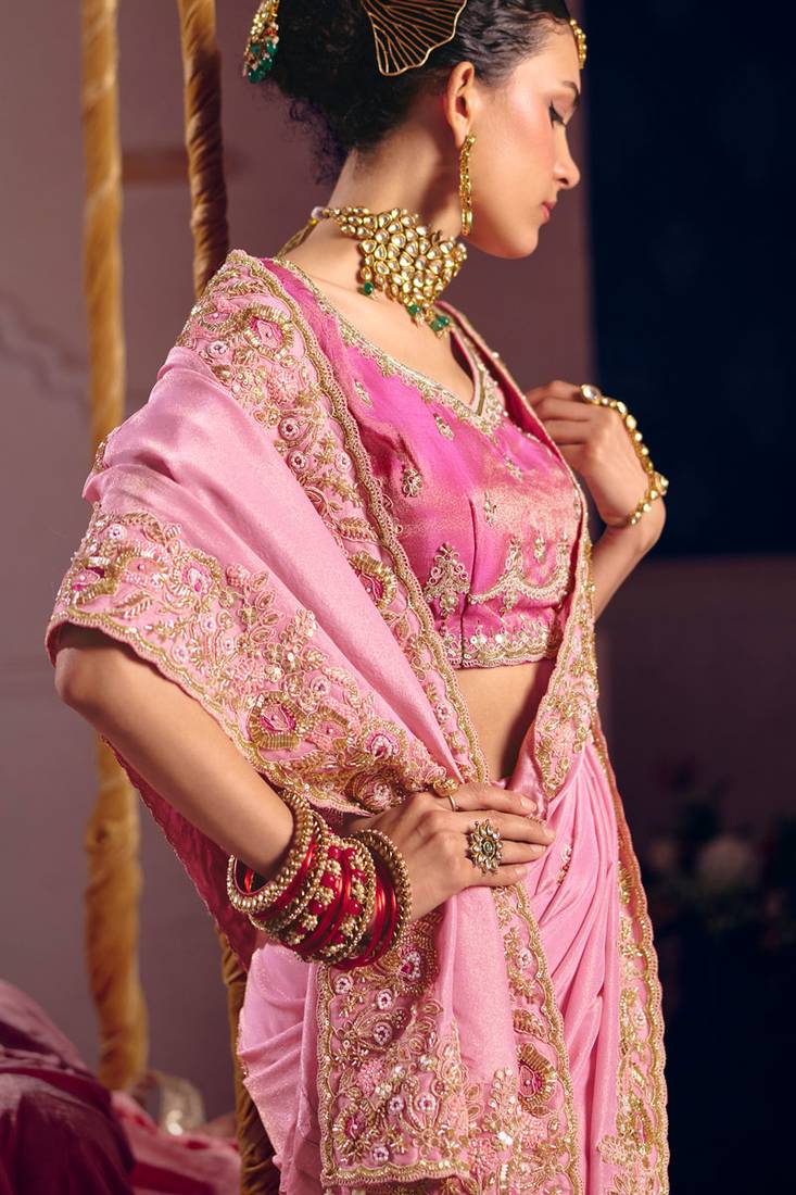 | Product Name | Pink Viscose Zari Tissue Silk Heavy Embroidery, Beads With Sequince Work Saree With Blouse | |