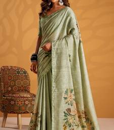 Pista green pure tussar silk printed with kasheeda work saree with blouse