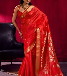 Red satin linen silk handloom zari weaving saree with blouse