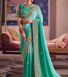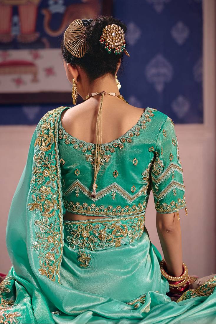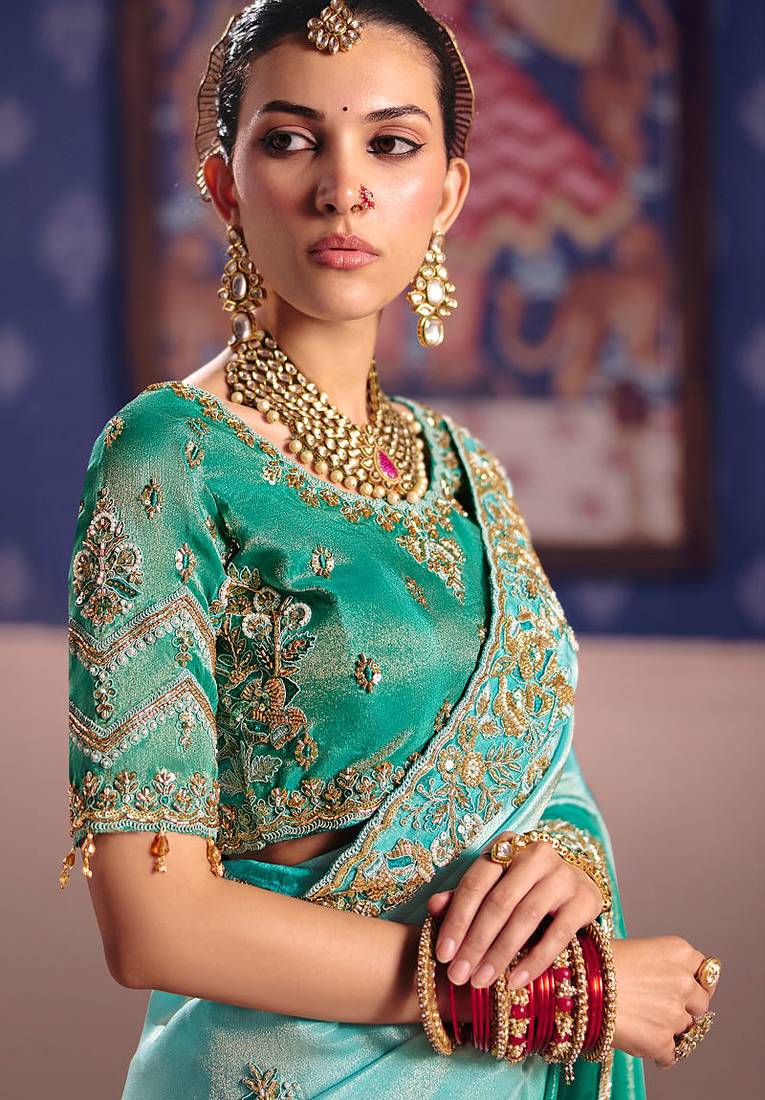 Turquoise viscose zari tissue silk heavy embroidery, beads with sequince work saree with blouse