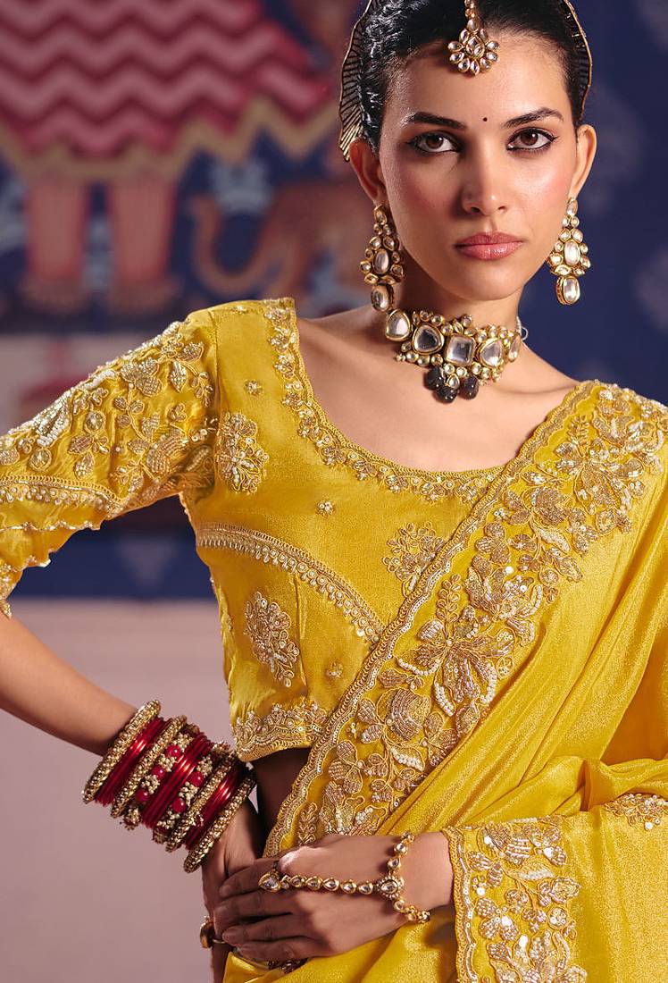 Yellow viscose zari tissue silk heavy embroidery, beads with sequince work saree with blouse