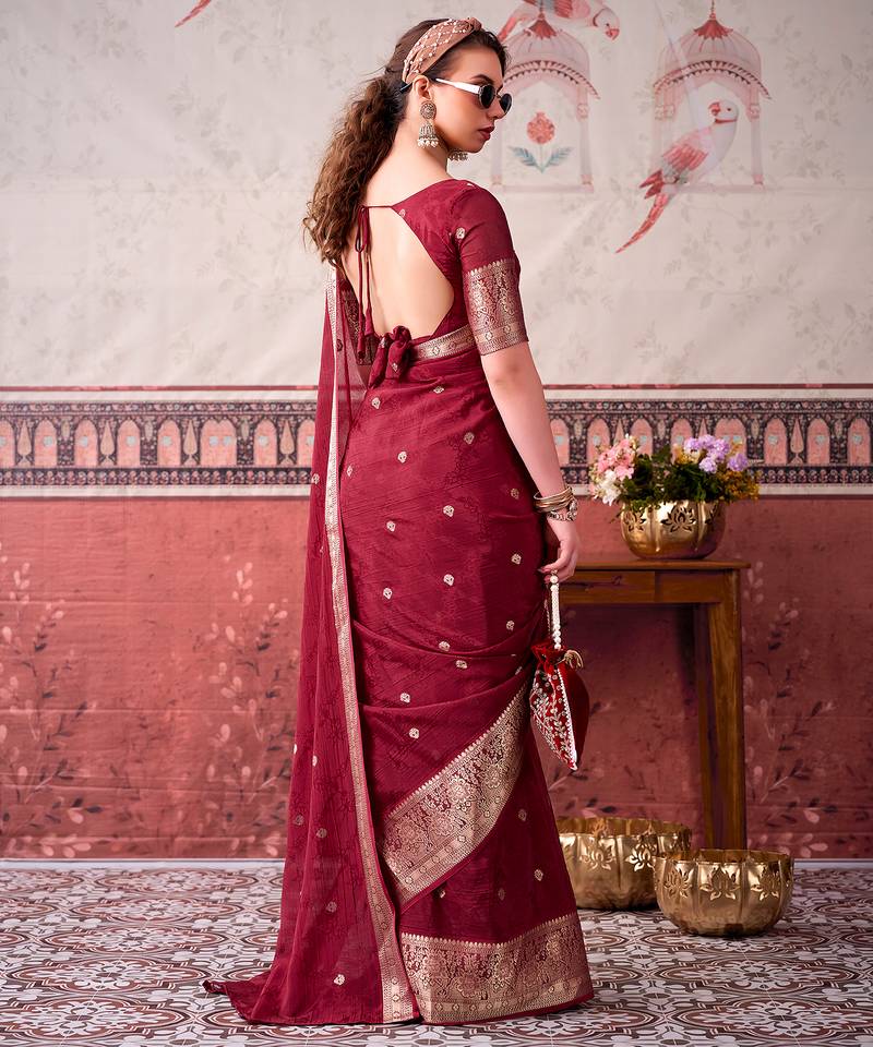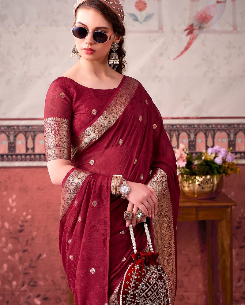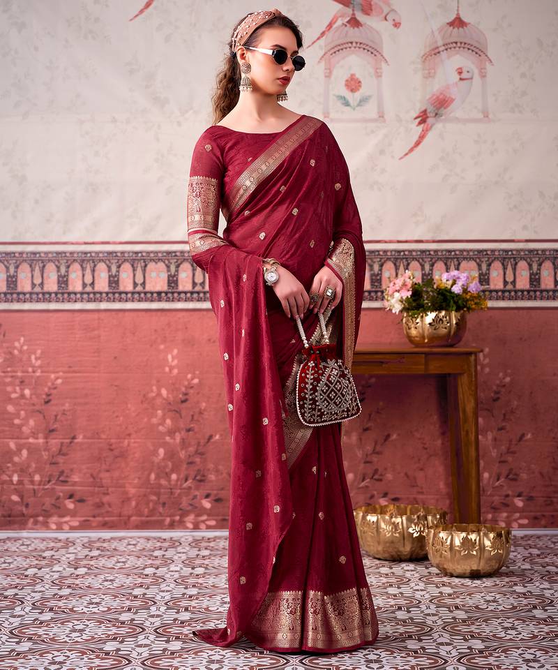 | • | Saree | : | Color- Maroon / Fabric- Silk |