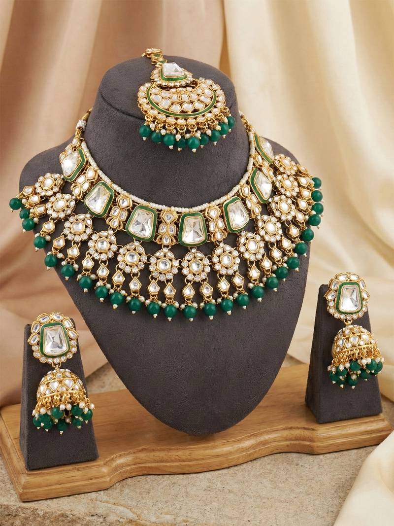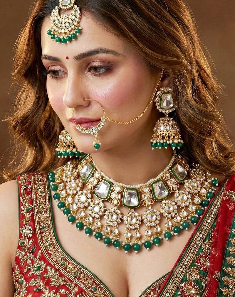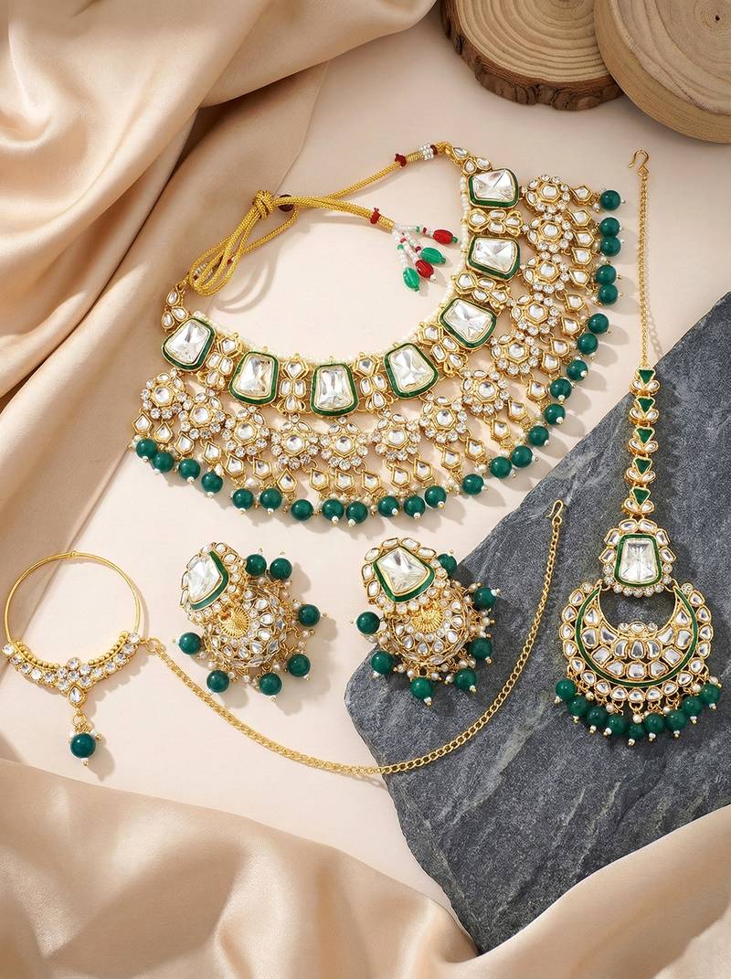 | Product Description | This Elegant Kundan Jewellery Set From Lucky Jewellery Is Crafted With A Rich 18 Kt Gold Plated Finish And Traditional Kundan Stone Work. Designed To Suit Both Bridal And Semi Bridal Occasions, The Set Offers A Perfect Blend Of Royal Elegance And Versatile Styling. The Necklace Is Beautifully Detailed With Kundan Stones And Bead Drops, Creating A Graceful Statement Look. Paired With Matching Earrings, Maang Tikka, And Nath, This Coordinated Set Is Ideal For Weddings, Receptions, Engagements, Festive Celebrations, And Traditional Functions. Perfectly Suited For Bridal Lehengas, Sarees, Anarkalis, And Festive Ethnic Wear, This Jewellery Set Allows Effortless Styling For Grand Bridal Looks As Well As Refined Semi Bridal Appearances. |