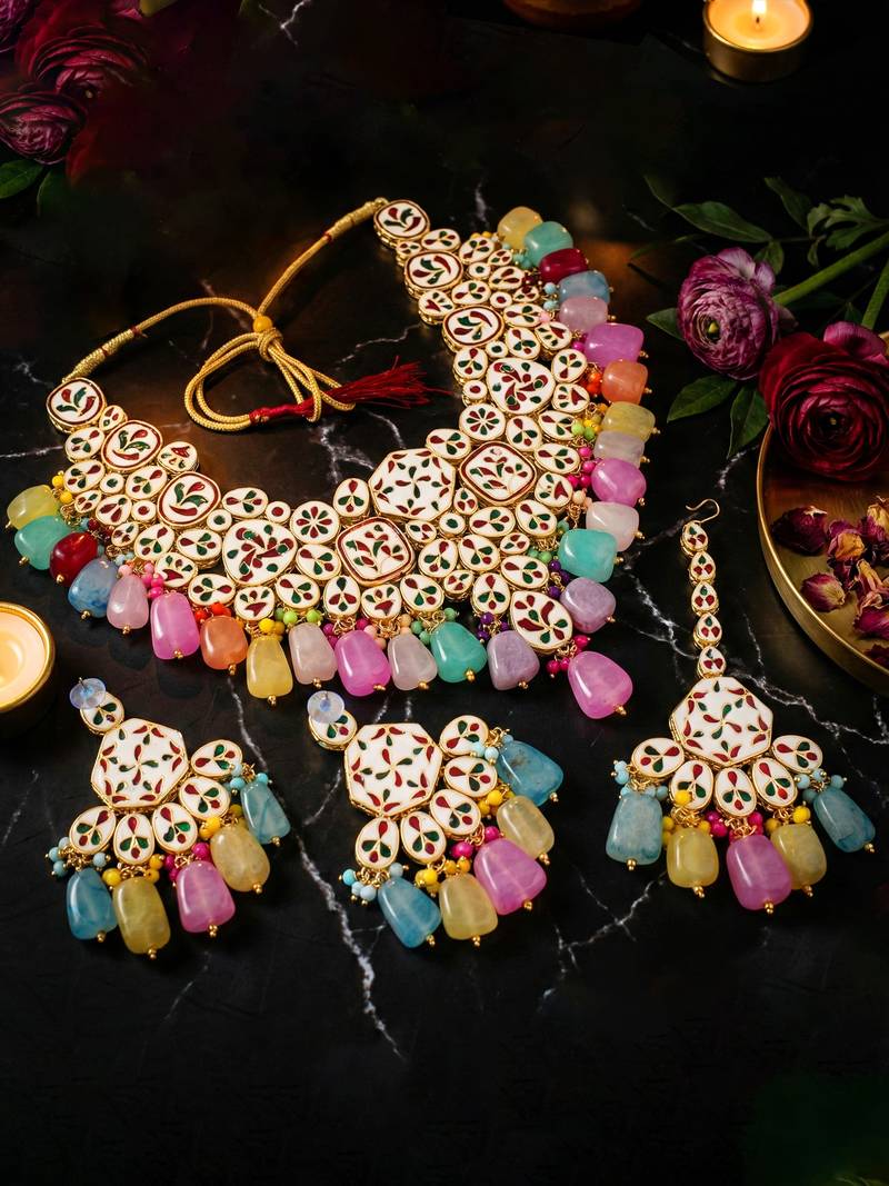 18 kt gold plated multi color kundan bridal & semi-bridal necklace set