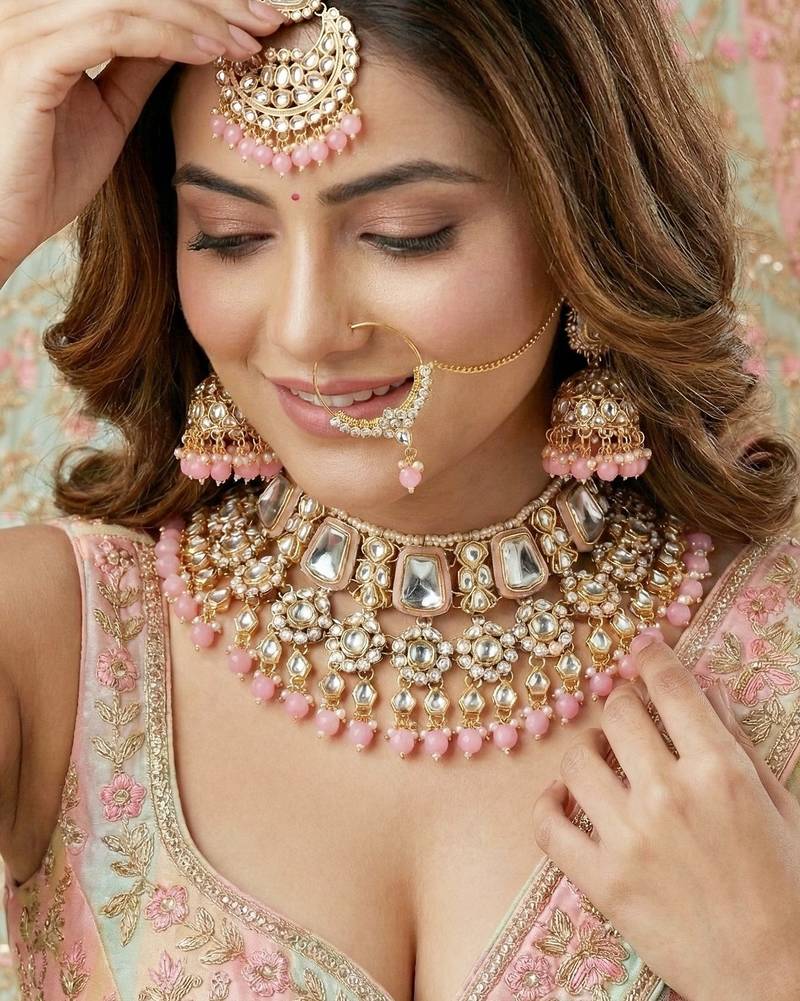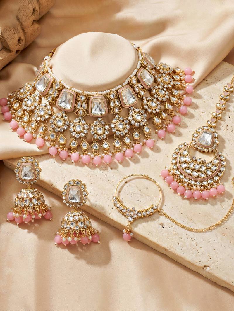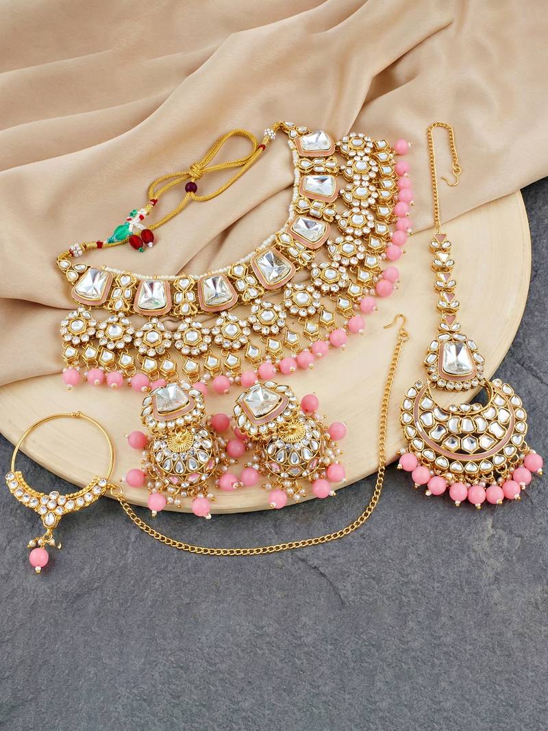 18 kt gold plated pink kundan bridal & semi-bridal necklace set