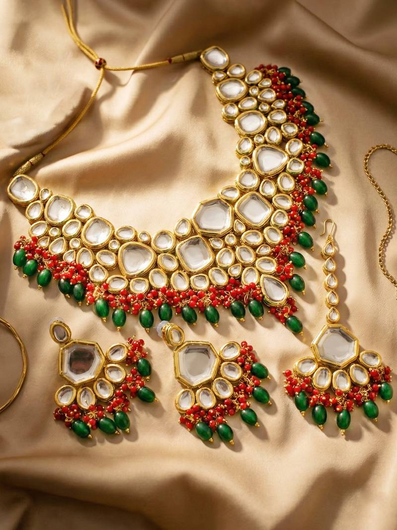 18 kt gold plated red green kundan bridal & semi-bridal necklace set