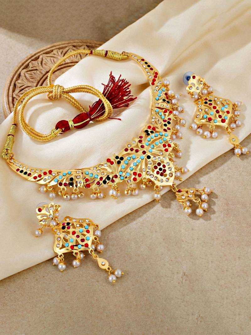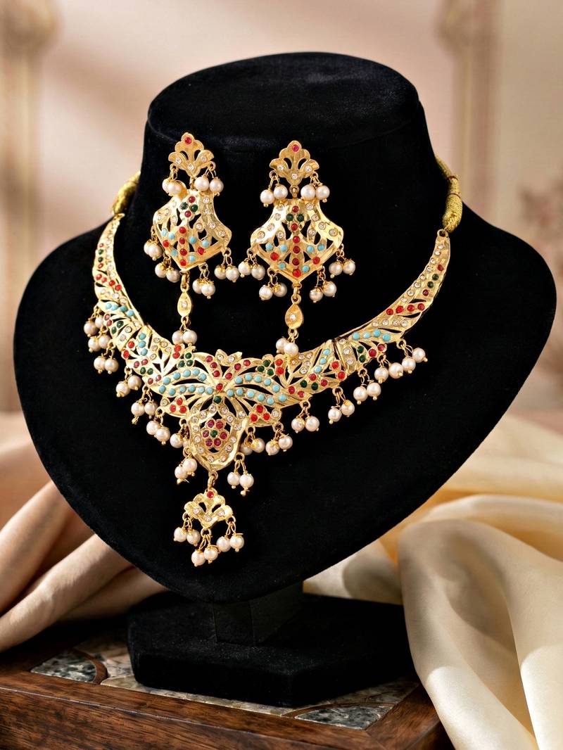 | Product Description | Enhance Your Traditional Look With This Exquisite Lucky Jewellery Gold Plated Necklace Set, Beautifully Crafted With Vibrant Multicolor Stones Representing The Auspicious Design. The Harmonious Blend Of Red, Green, Blue, And Other Radiant Stones Adds A Royal And Festive Charm To Your Ensemble. |