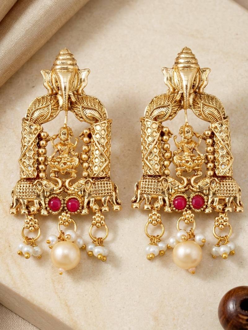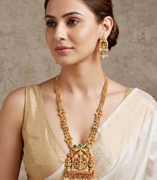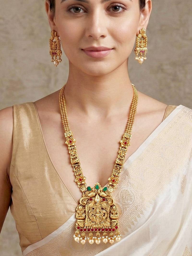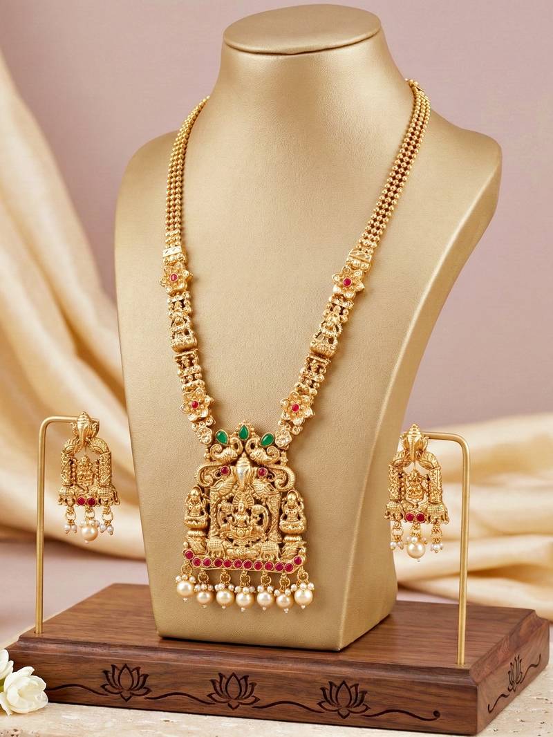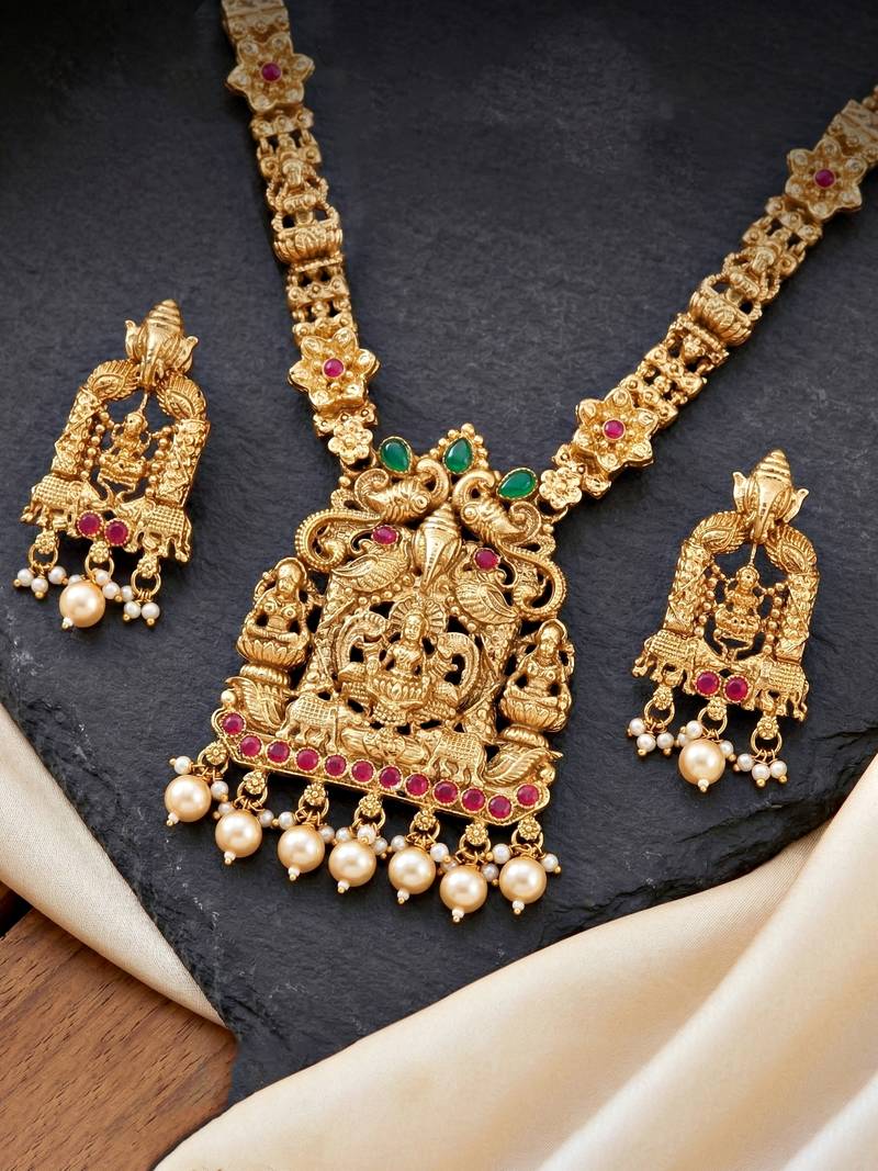 | Product Description | Elegant Gold Plated Temple Jewellery Necklace Set Featuring Ganesh And Lakshmi Design With Ruby And Green Color Accents And Pearl Drops. Perfect For Weddings, Festivals And Traditional Occasions. |