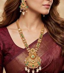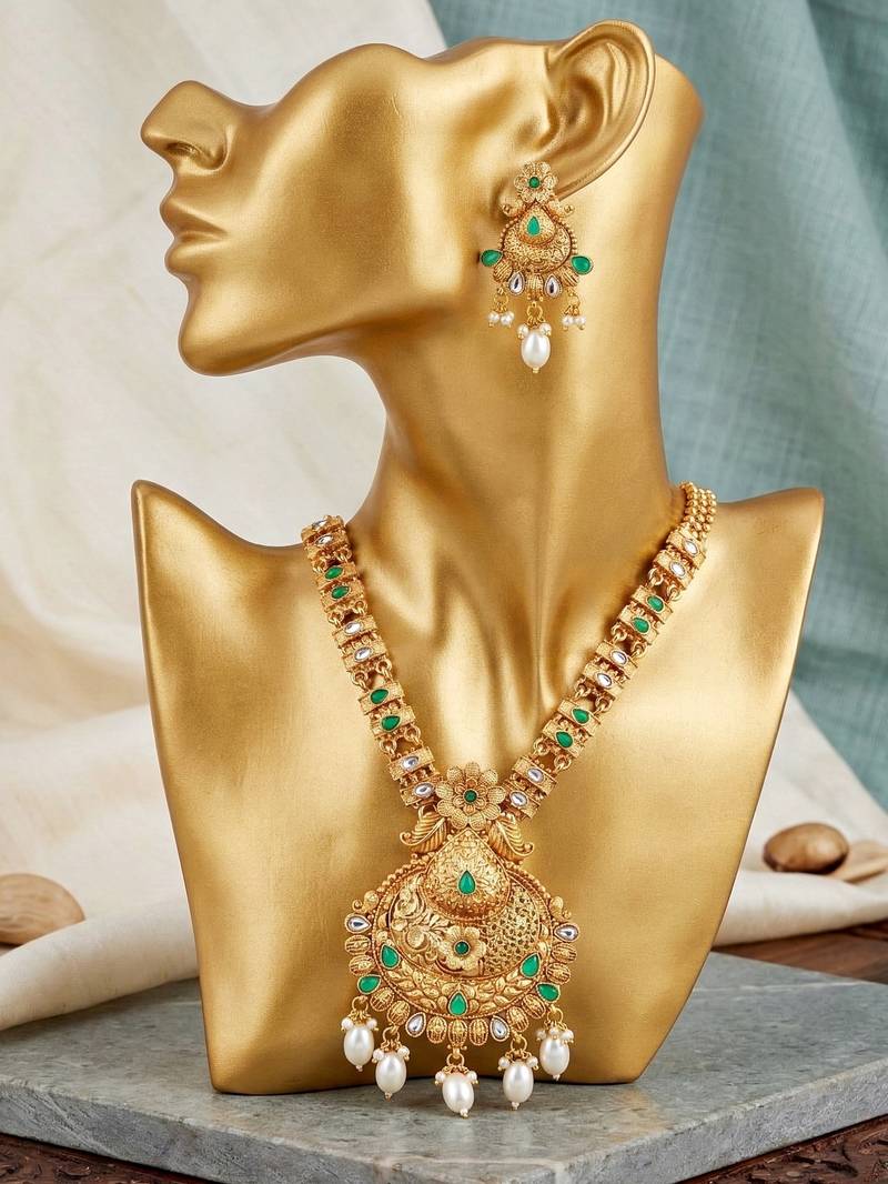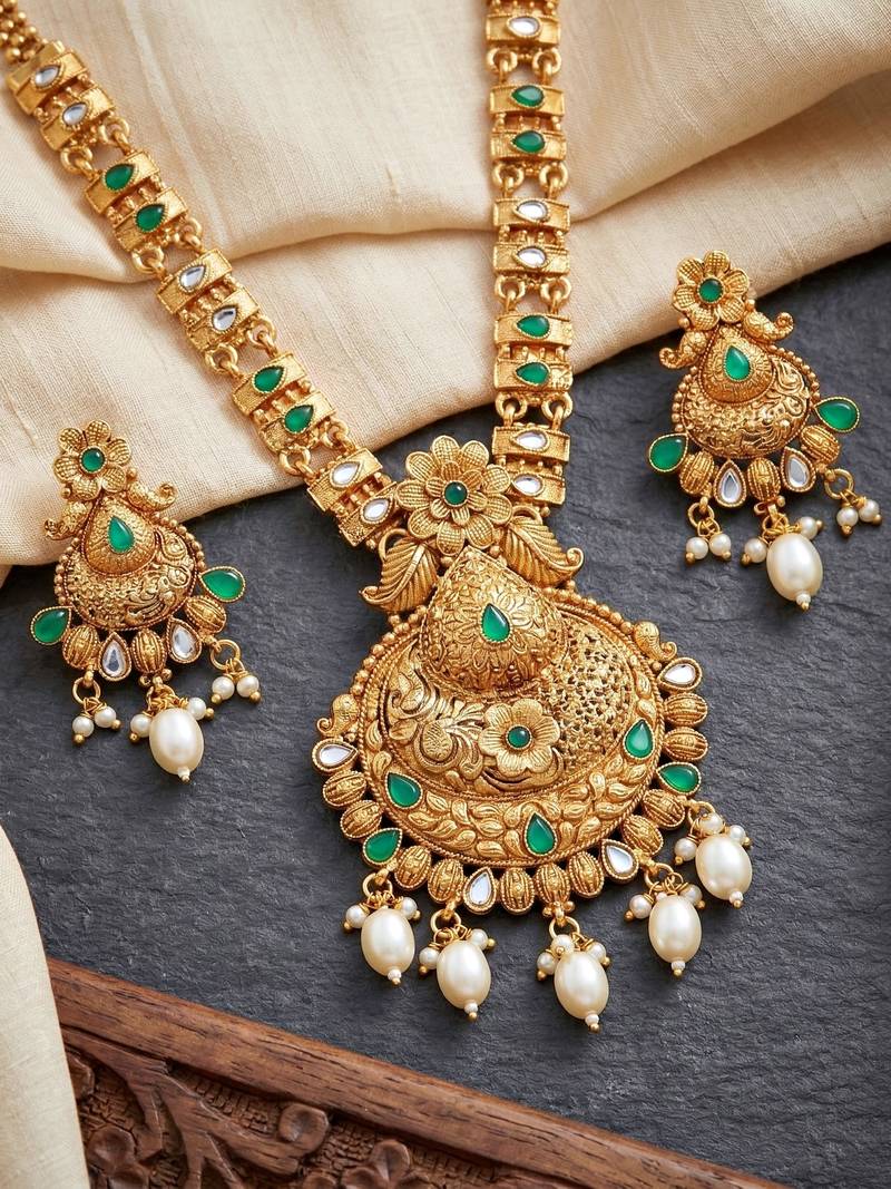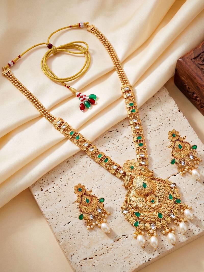 | Product Description | Elegant Gold Plated Long Necklace Set Featuring Green Color Accents And Pearl Drops. Perfect For Weddings, Festive Occasions And Traditional Ethnic Wear. |