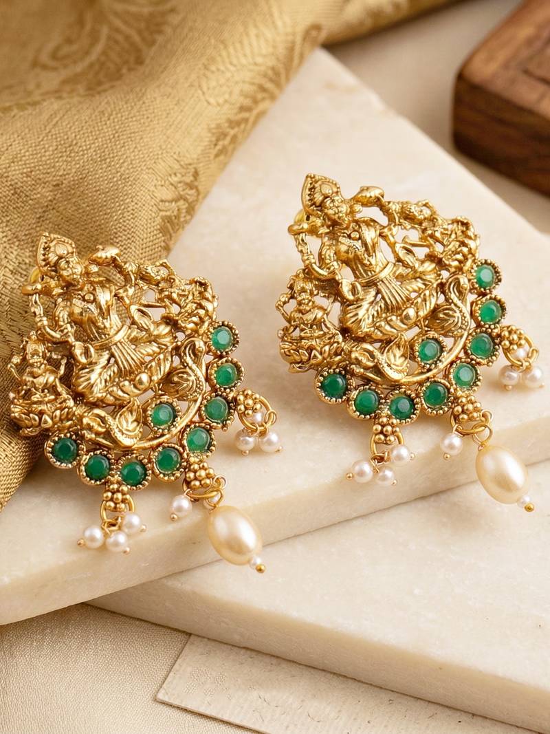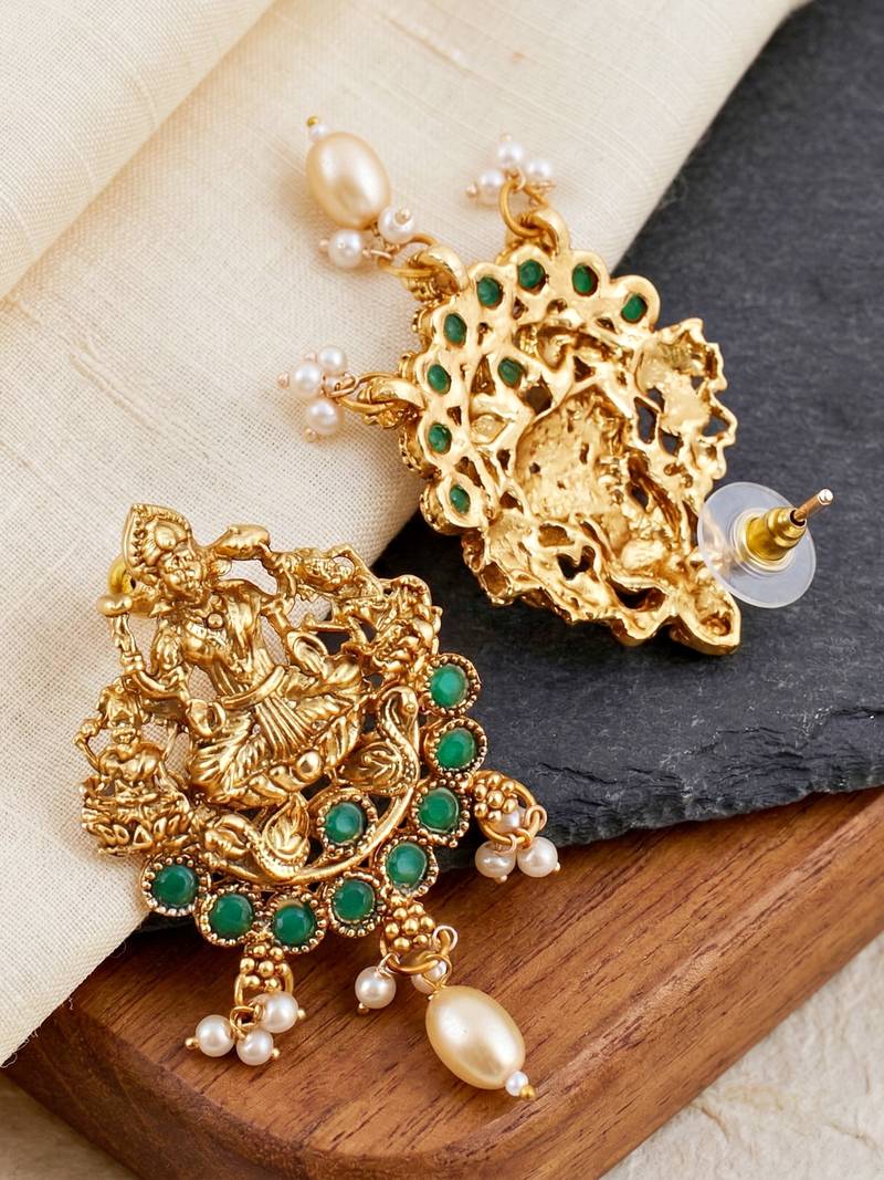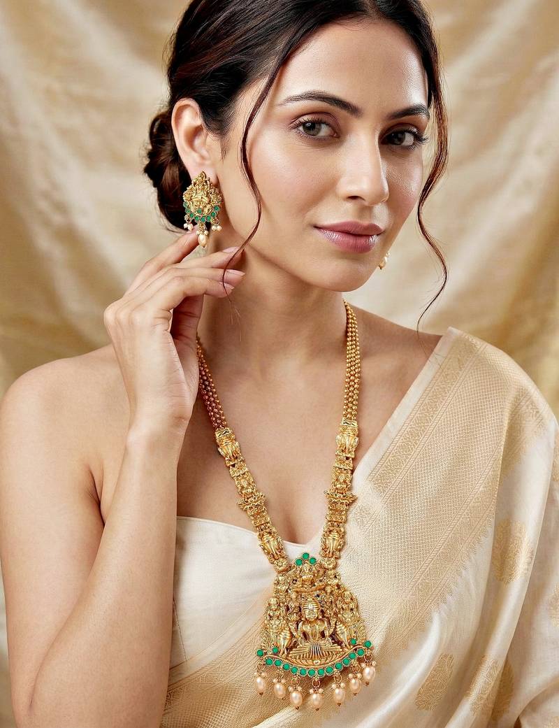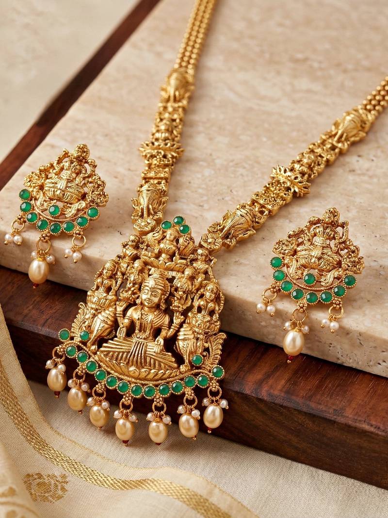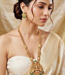 | Product Description | Elegant Gold Plated Temple Jewellery Necklace Set Featuring Goddess Lakshmi Idol Design With Green Color Stone Accents And Pearl Drops. Perfect For Weddings, Festivals And Traditional Occasions. |