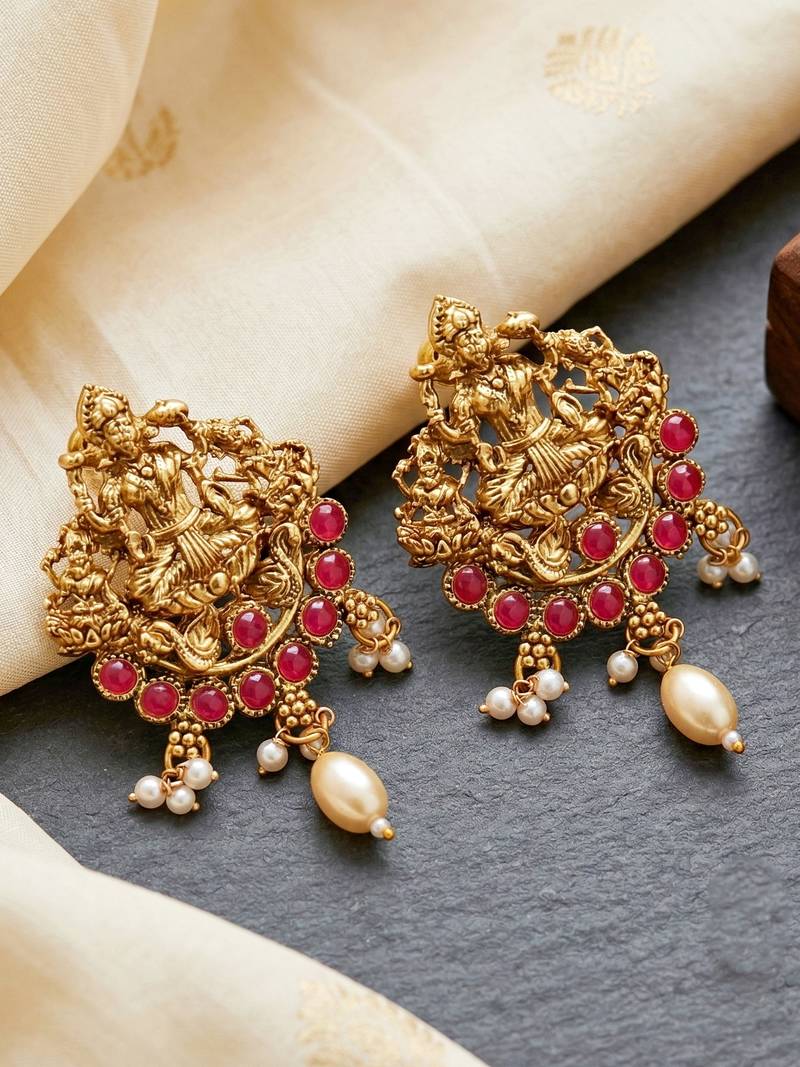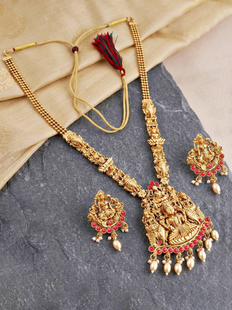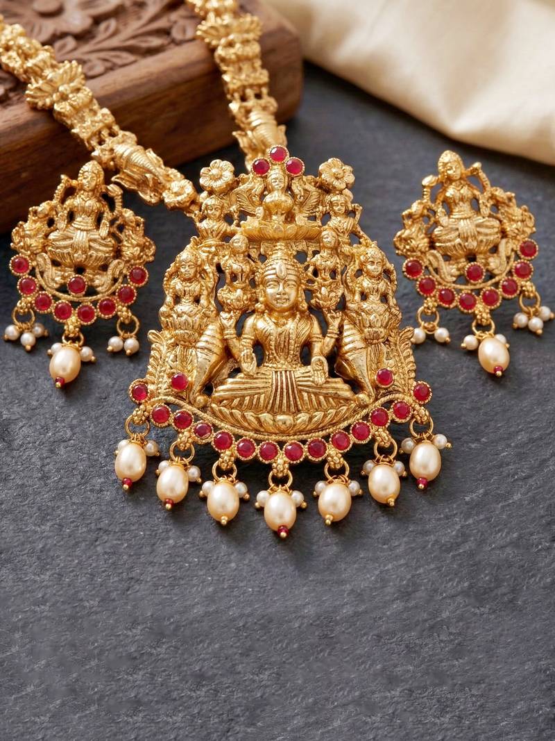 | Product Description | Elegant Gold Plated Temple Jewellery Necklace Set Featuring Goddess Lakshmi Idol Design With Ruby Color Stone Accents And Pearl Drops. Perfect For Weddings, Festivals And Traditional Occasions. |