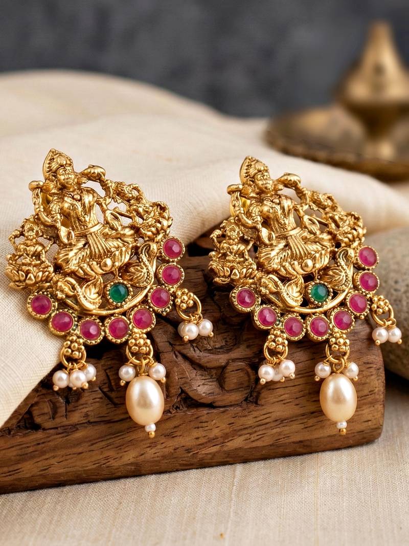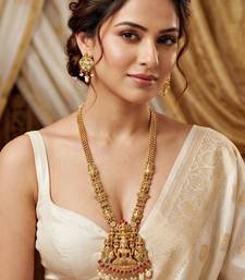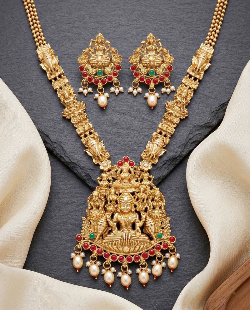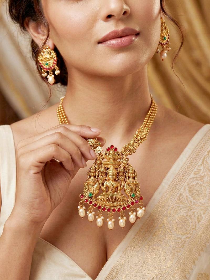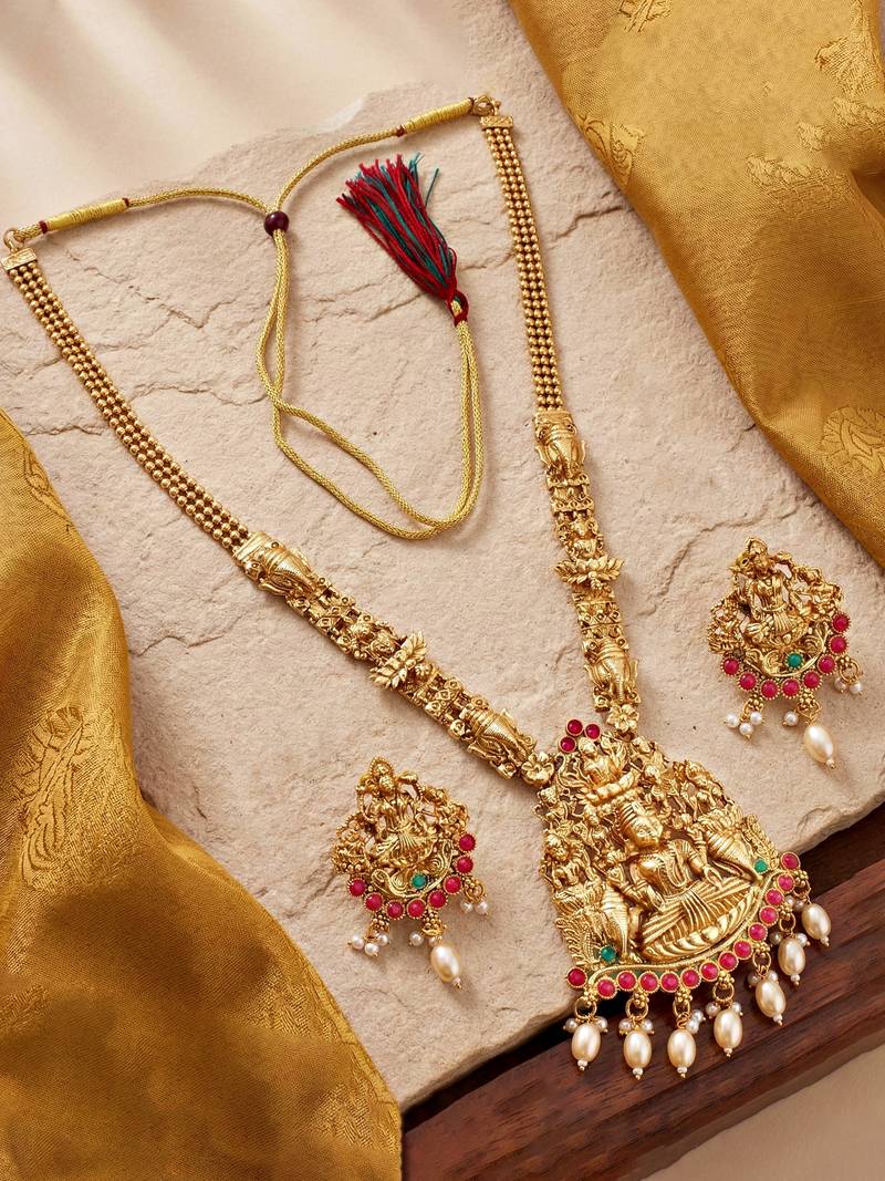 | Product Description | Elegant Gold Plated Temple Jewellery Necklace Set Featuring Goddess Lakshmi Idol Design With Ruby And Green Color Accents And Pearl Drops. Perfect For Weddings, Festivals And Traditional Occasions. |