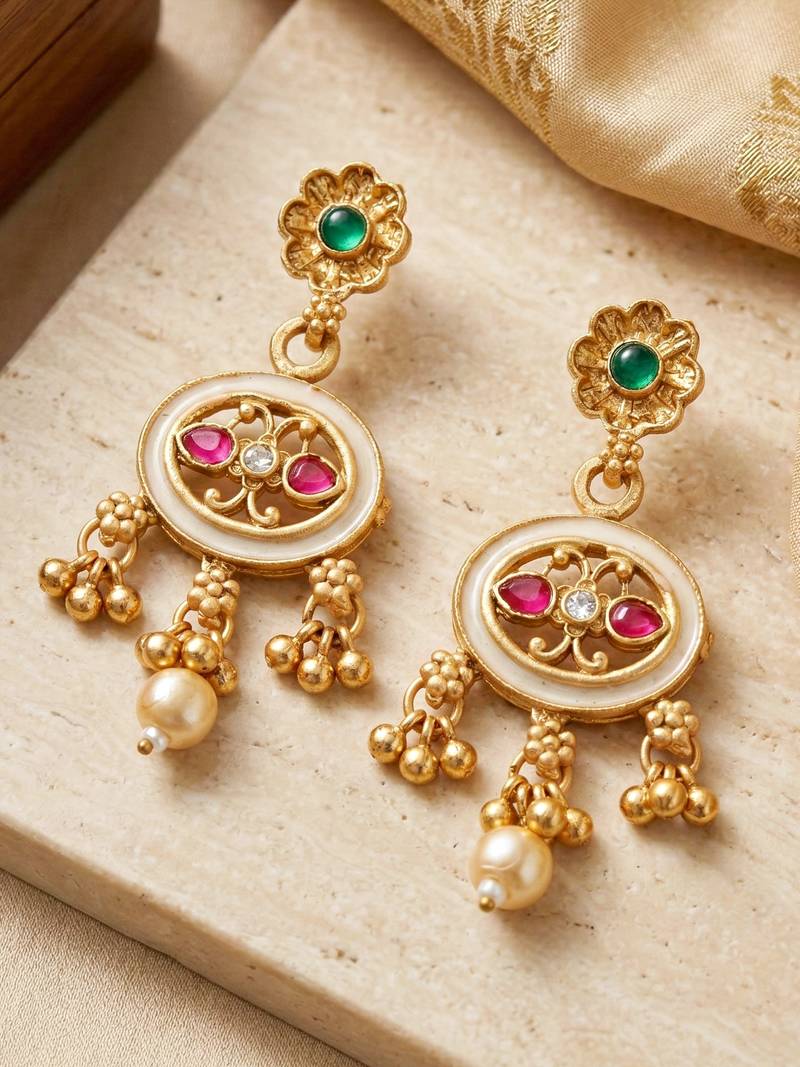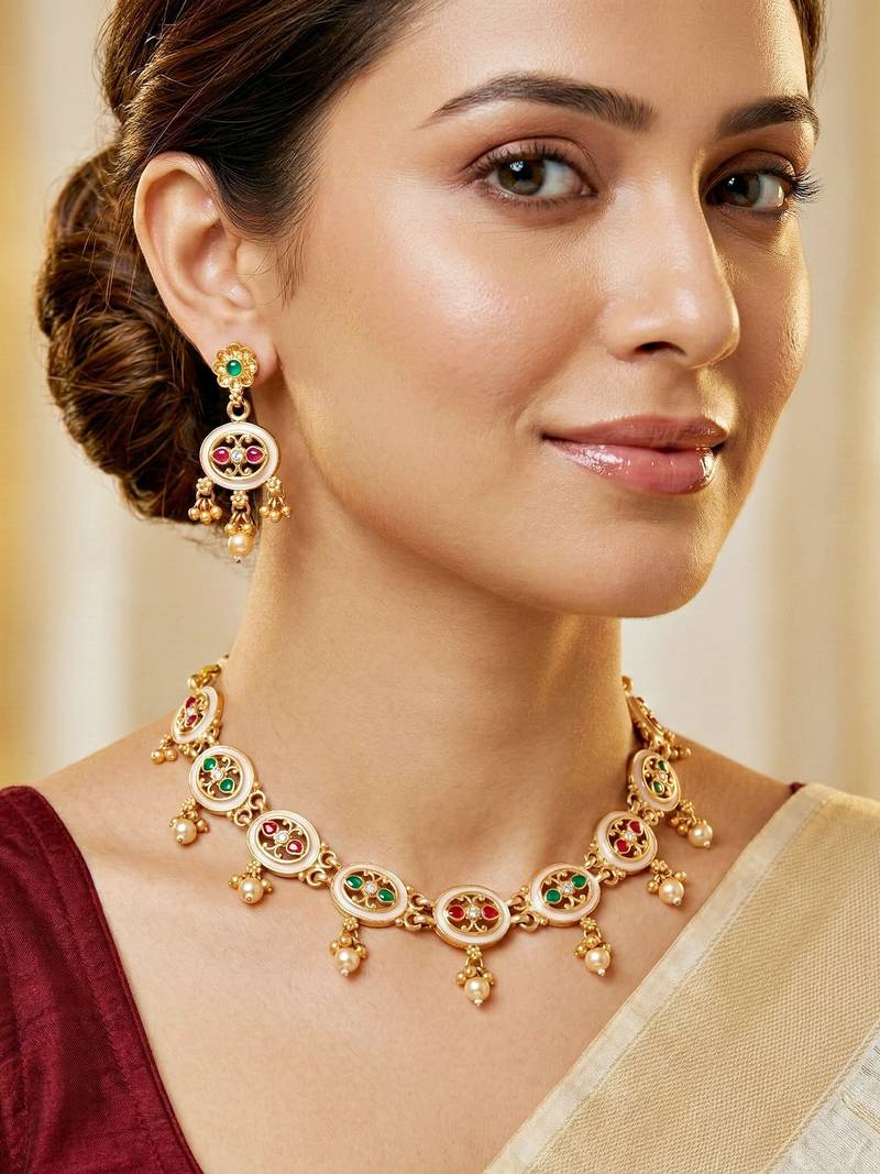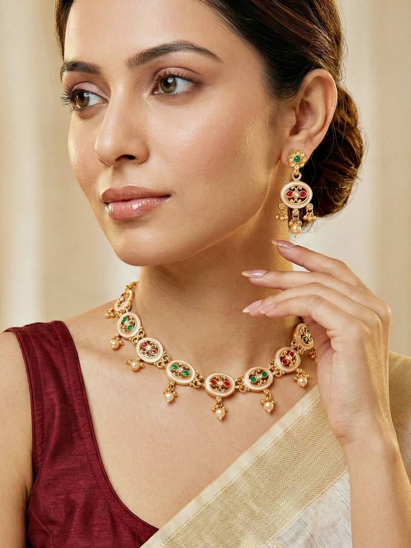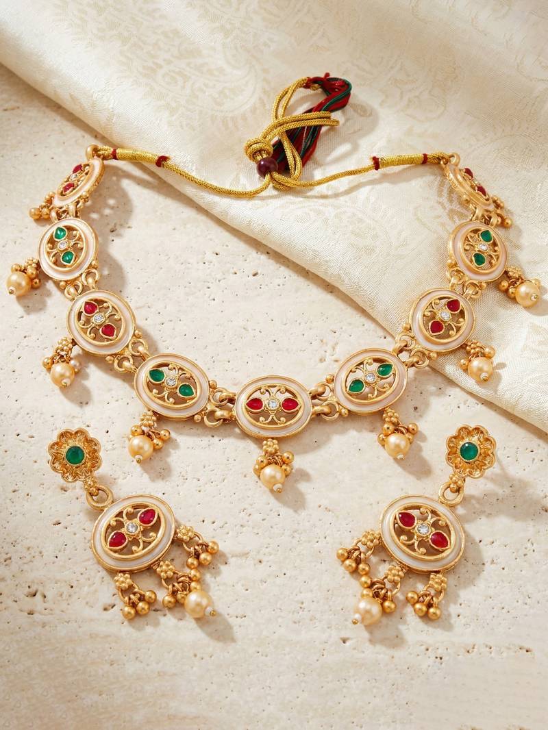 | Product Description | Elegant Gold Plated Meenakari Necklace Set From Lucky Jewellery Featuring Red And Green Stones With Pearl Drop Accents. Perfect For Weddings, Festive Occasions And Traditional Ethnic Outfits |