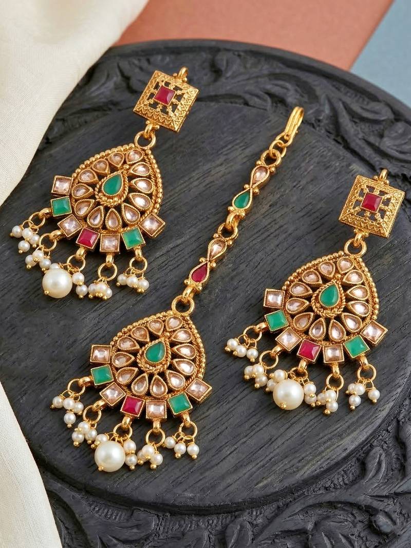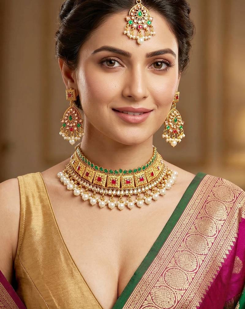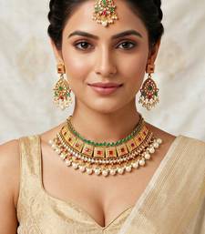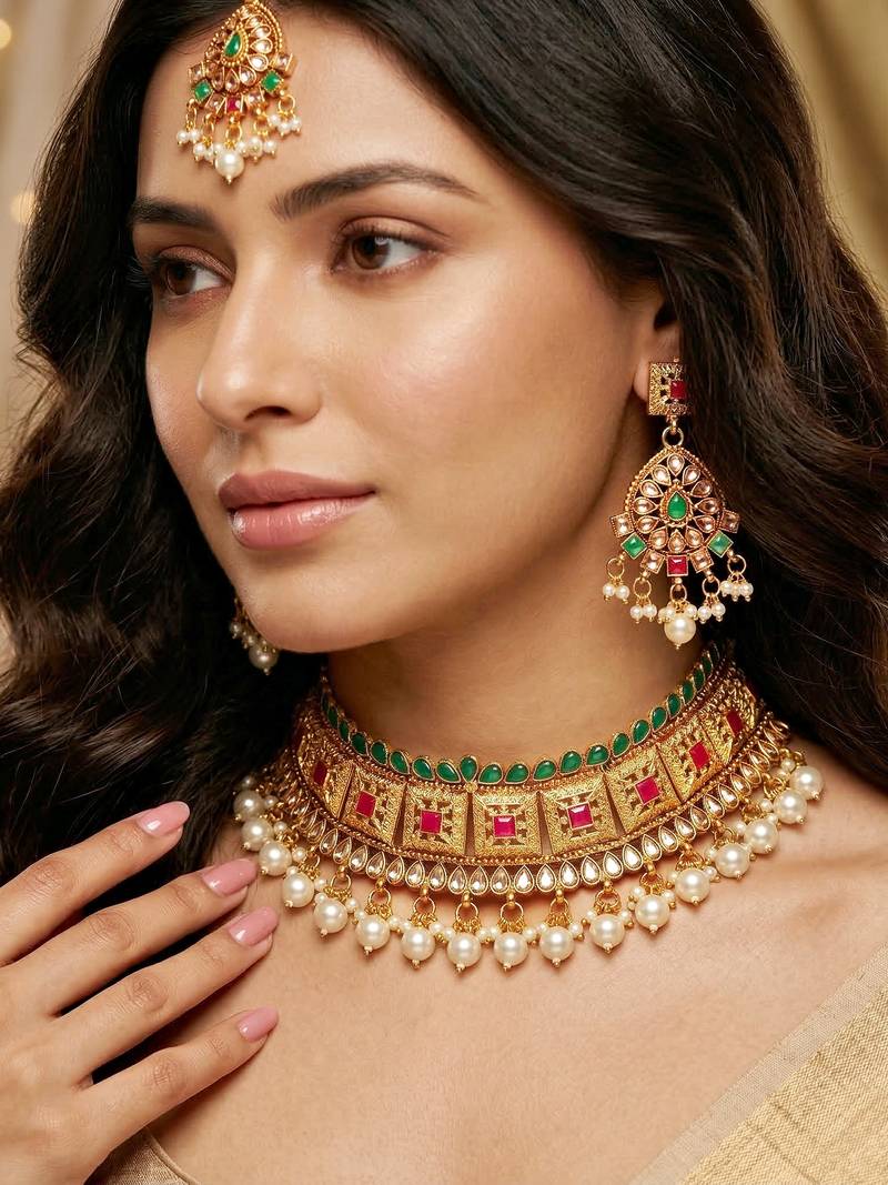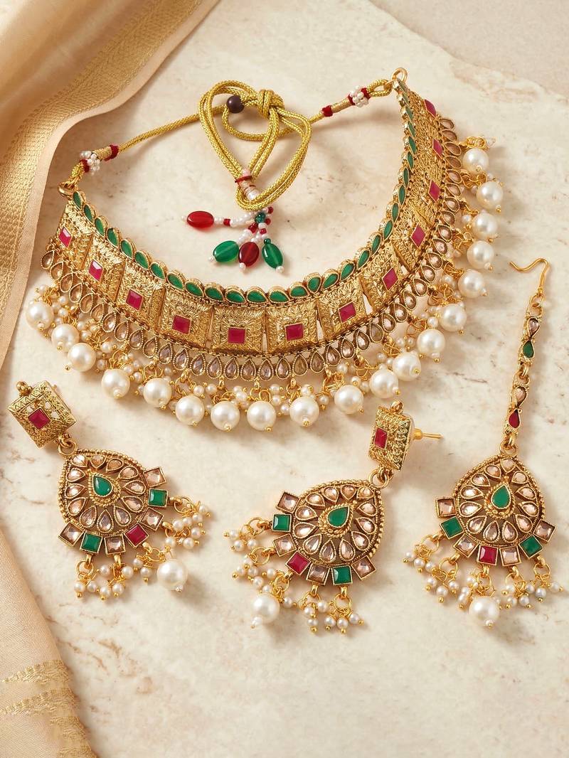 | Product Description | Gold Plated Choker Necklace Set With Ruby And Green Color Stones And Pearl Drops. Includes Matching Earrings And Maang Tikka, Perfect For Weddings And Festive Occasions. |