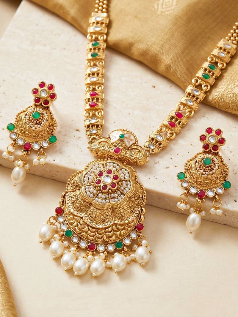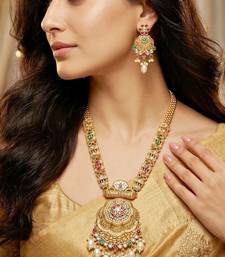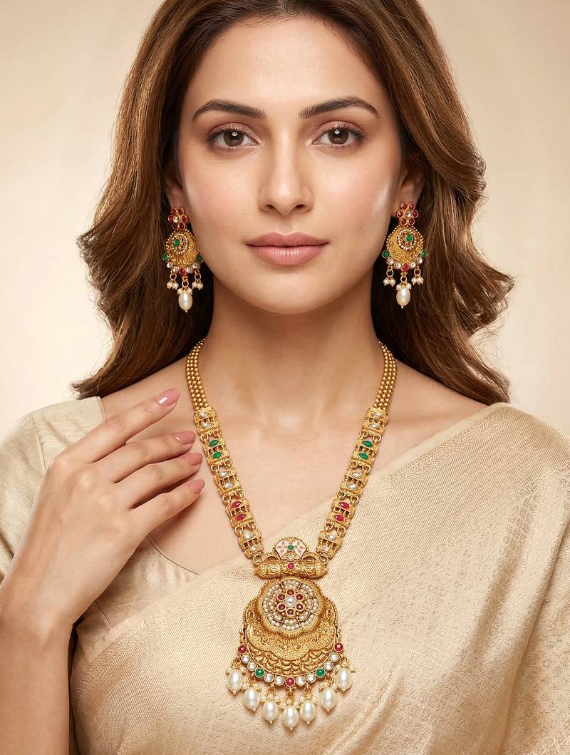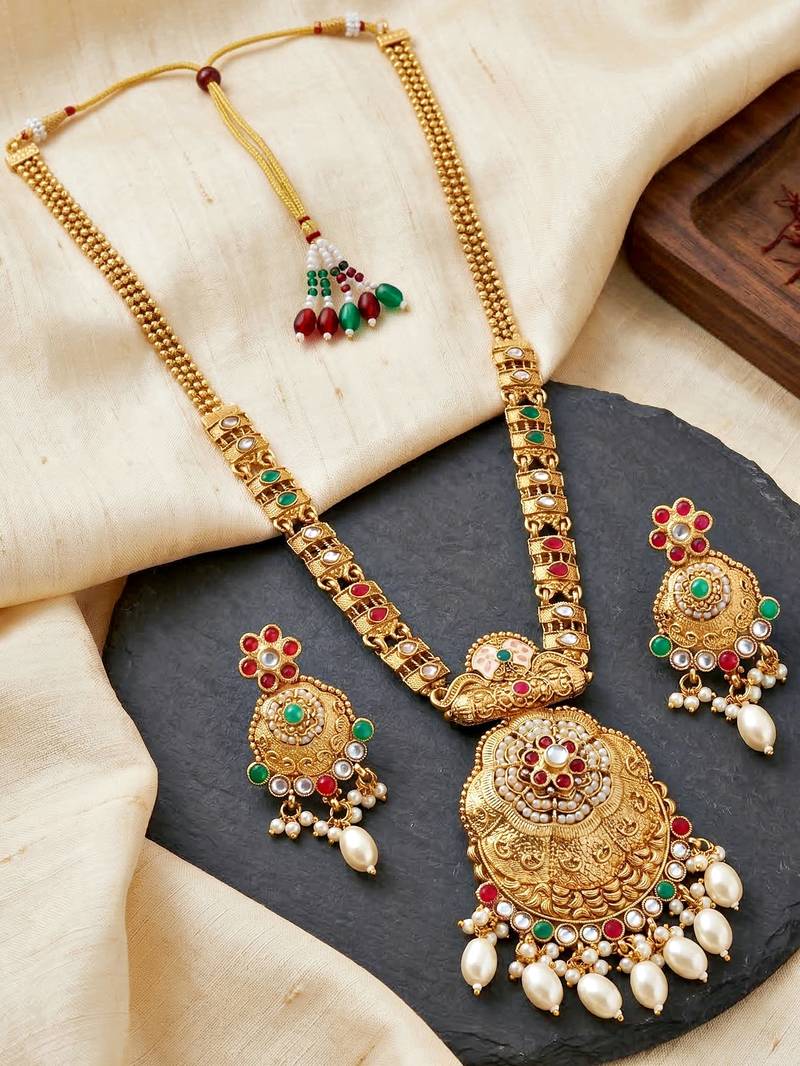 | Product Description | Elegant Gold Plated Long Necklace Set Featuring Ruby And Green Color Accents With Pearl Drops. Perfect For Weddings, Festive Occasions And Ethnic Wear. |