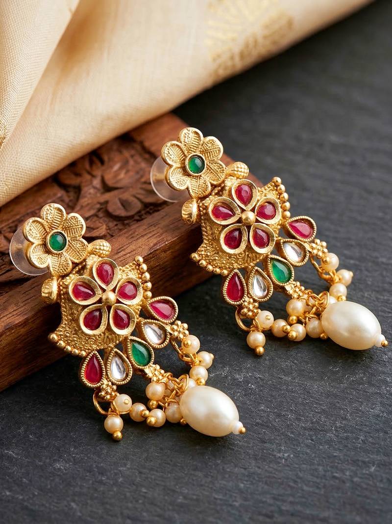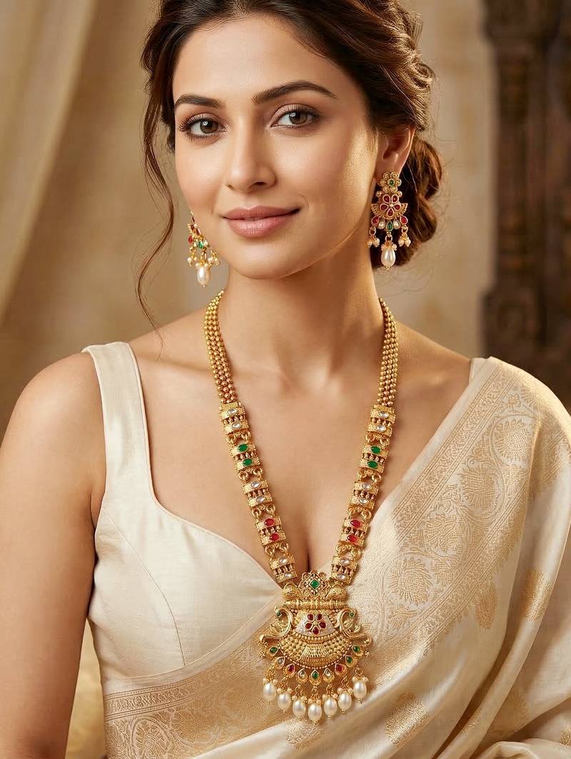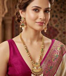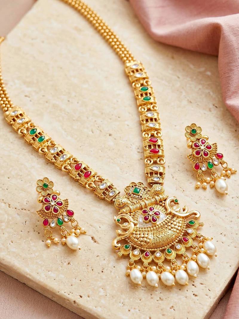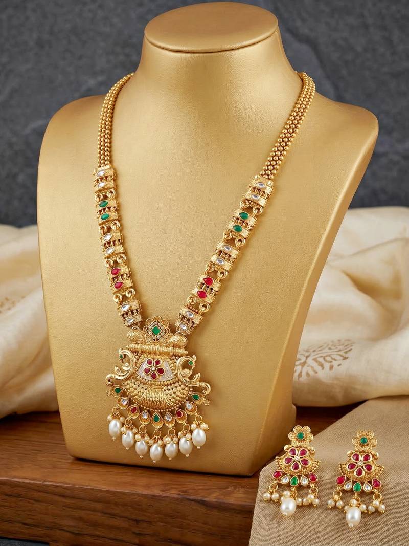 | Product Description | Elegant Gold Plated Long Necklace Set Featuring Ruby And Green Color Accents With Pearl Drops. Perfect For Weddings, Festive Occasions And Ethnic Wear. |