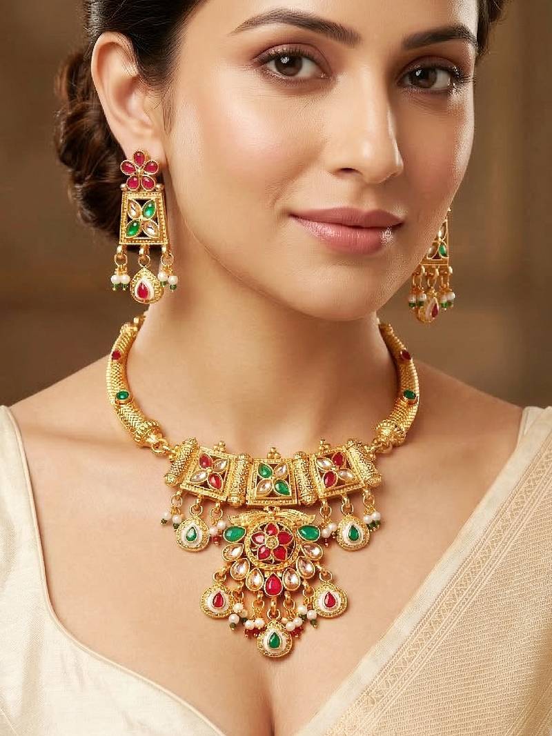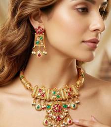 | Product Description | Elegant Gold Plated Traditional Necklace Set Featuring Ruby And Green Color Accents With Pearl Drops. Perfect For Weddings, Festive Occasions And Ethnic Wear. |