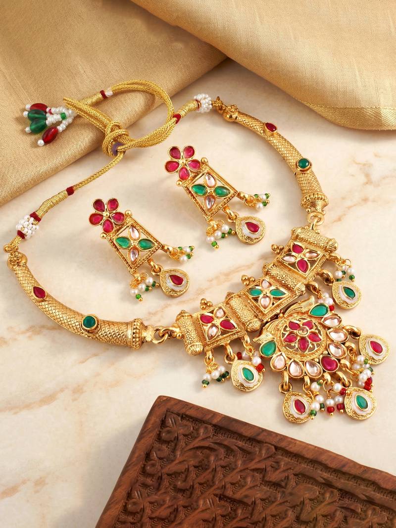 Lucky jewellery gold-plated ruby & green color traditional necklace set