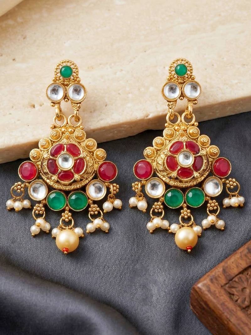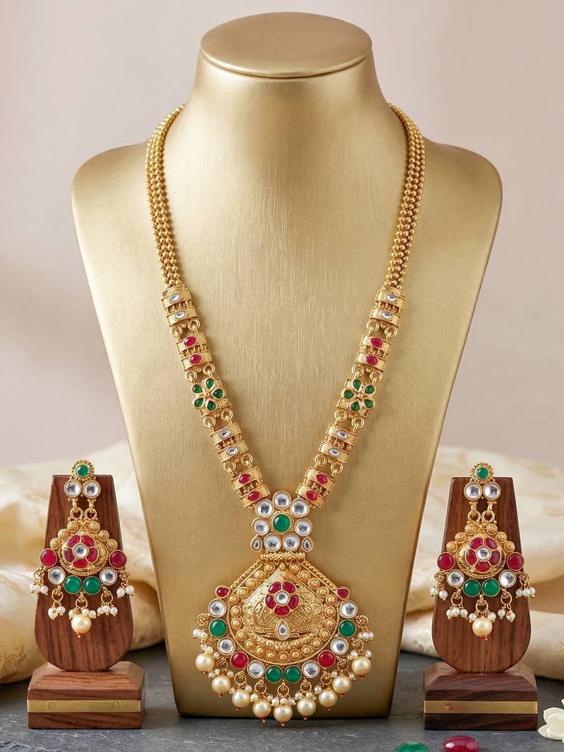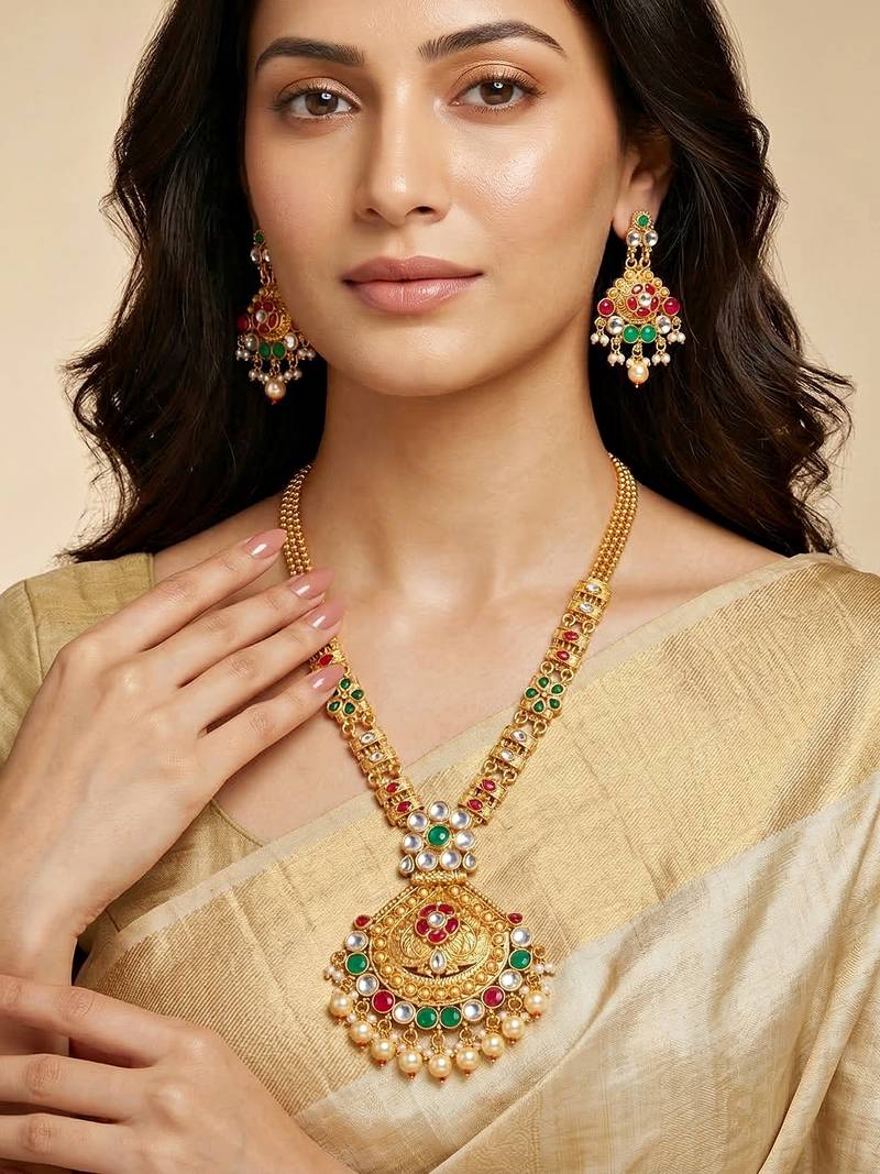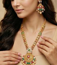 | Product Description | Elegant Gold Plated Traditional Necklace Set Featuring Ruby And Green Color Accents With Pearl Drops. Perfect For Weddings, Festive Occasions And Ethnic Wear. |
